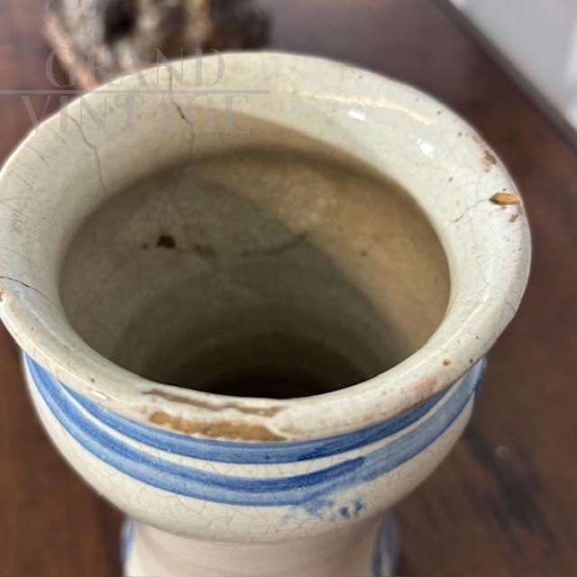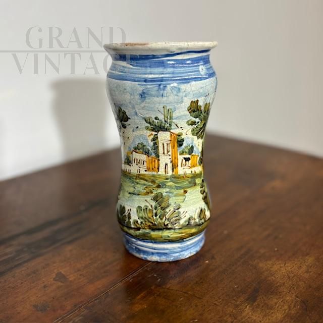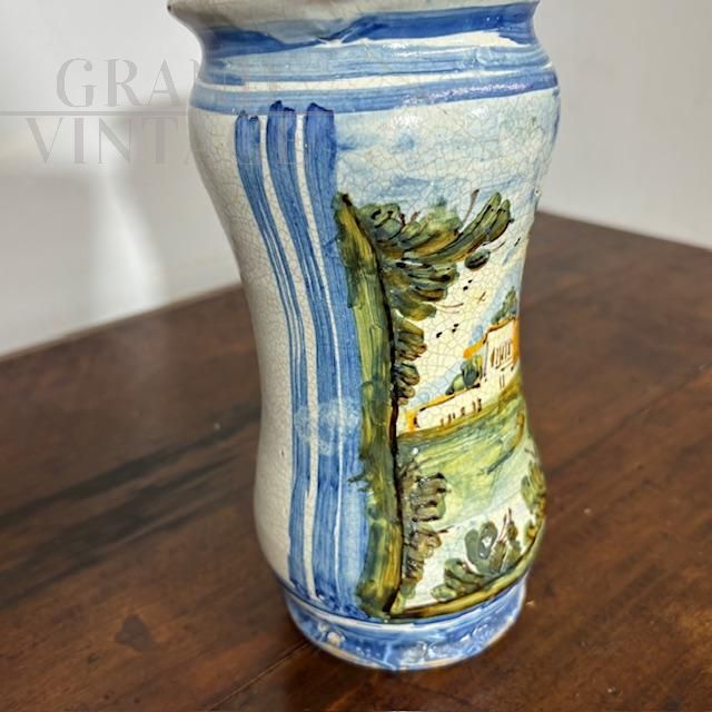 Antique splendid Albarello majolica ceramic pharmacy vase from the 18th century, used to contain preparations in ancient pharmacies, manufactured in Naples.