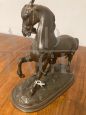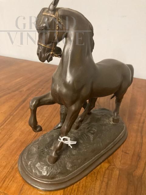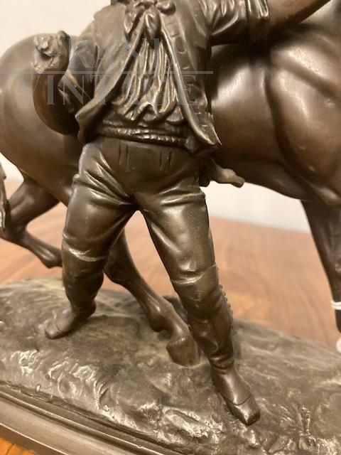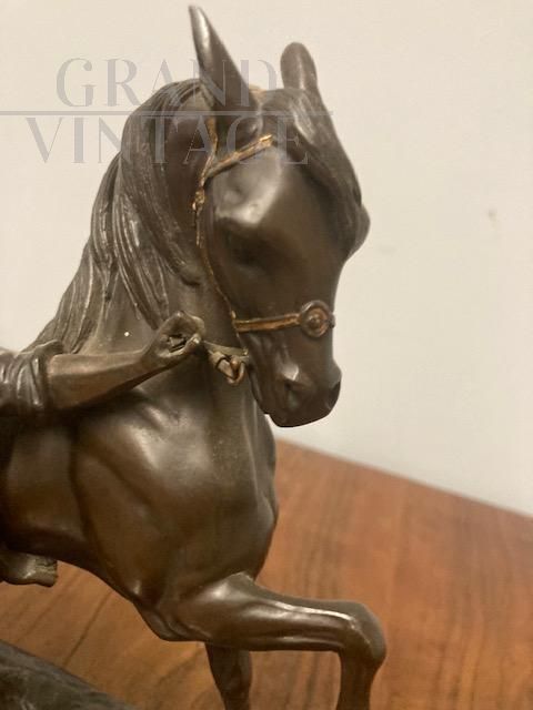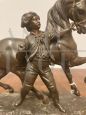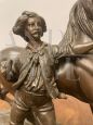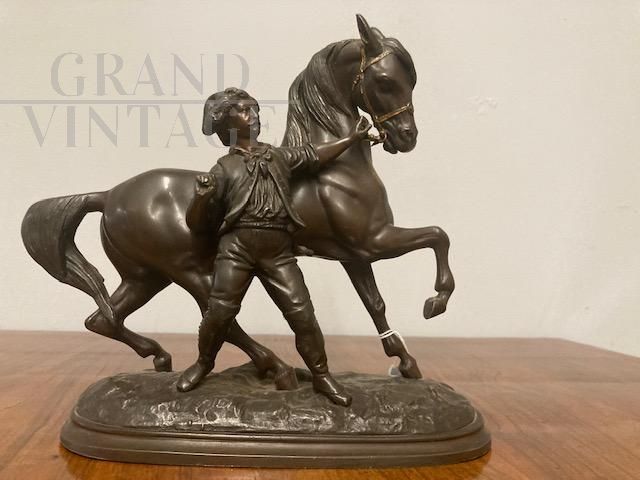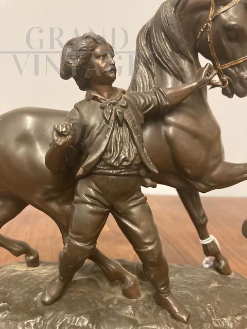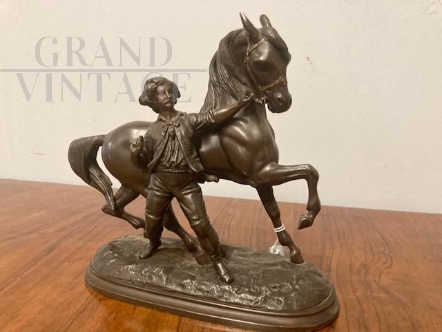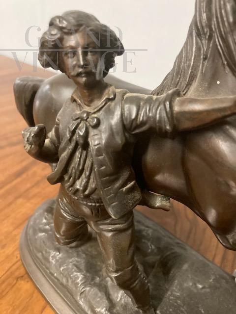 Antique sculpture with horse and character in antimony from the end of the 19th century, beautifully made and in excellent condition.
