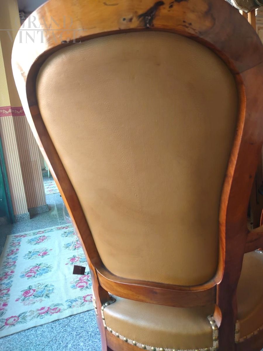 Antique armchair from the early 19th century in solid walnut wood, covered in hazelnut color leather, complete with wheels in the front legs.