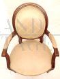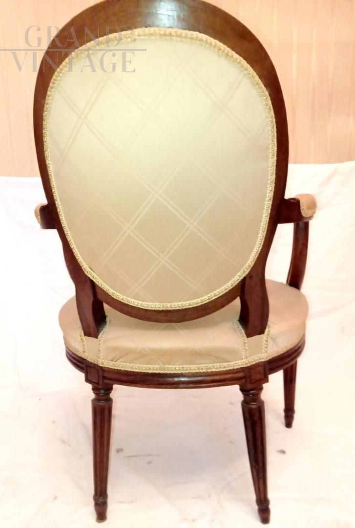 Antique walnut armchair well padded and covered with elegant beige silk fabric, comfortable seat ideal for relaxation or conversation. The price refers to the single armchair, the pair is available.