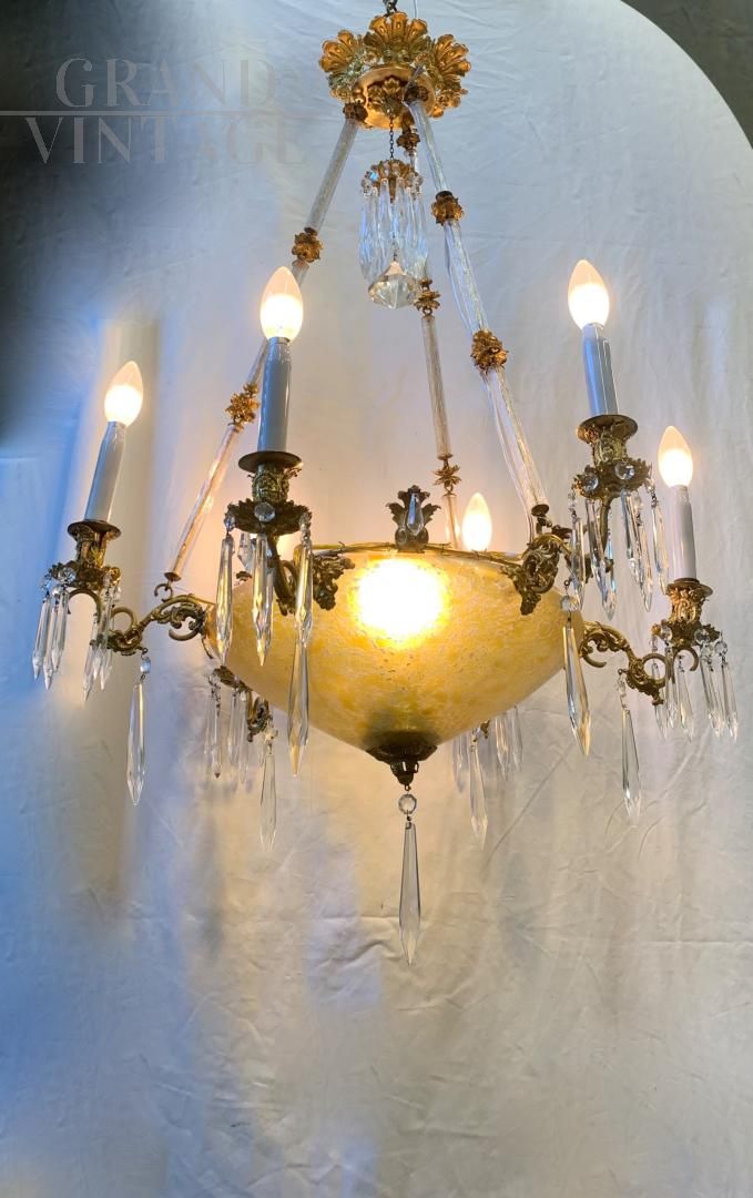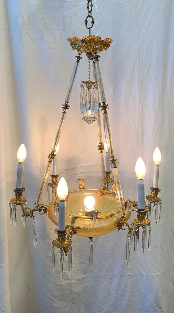 Beautiful Austrian chandelier from the early 1900s with 6 lights with E14 bulb and a central light with E27 bulb. Medium sized chandelier, The external lights are including glass candles. It has a beautiful and delicate line typical of the early 1900s, ocher and transparent etched glass. The structure is in gold painted brass. New electrical system, suitable for the use of LED bulbs. The chandelier has some natural signs of aging, but the glasses are in perfect condition. Excellent piece to decorate several rooms, it does not glare if milky white bulbs are fitted.