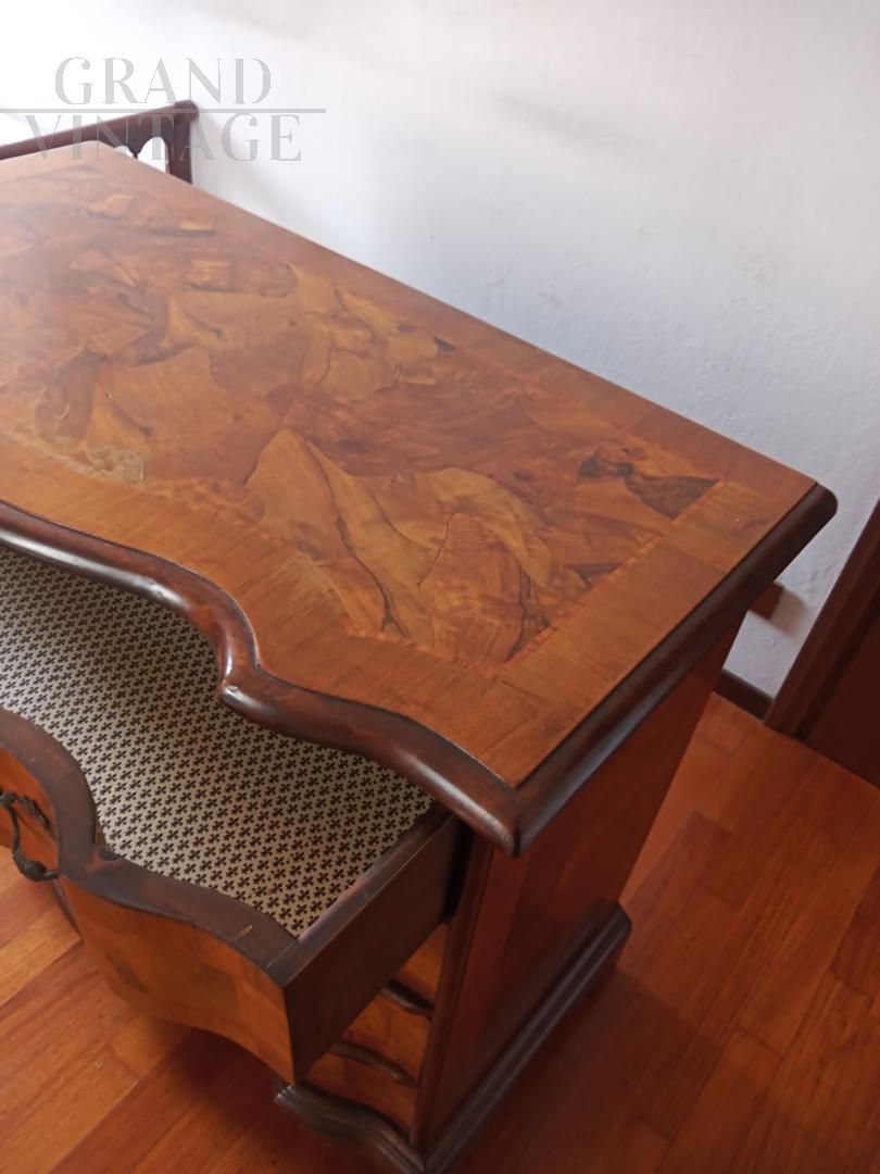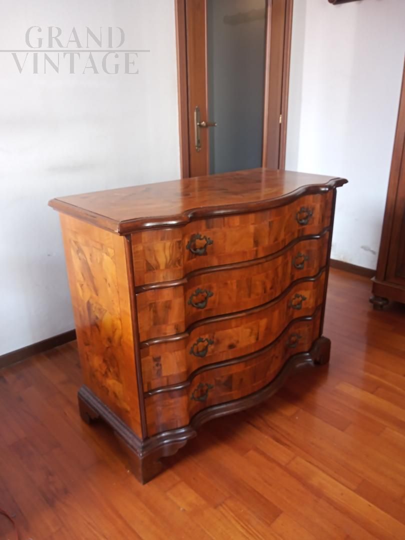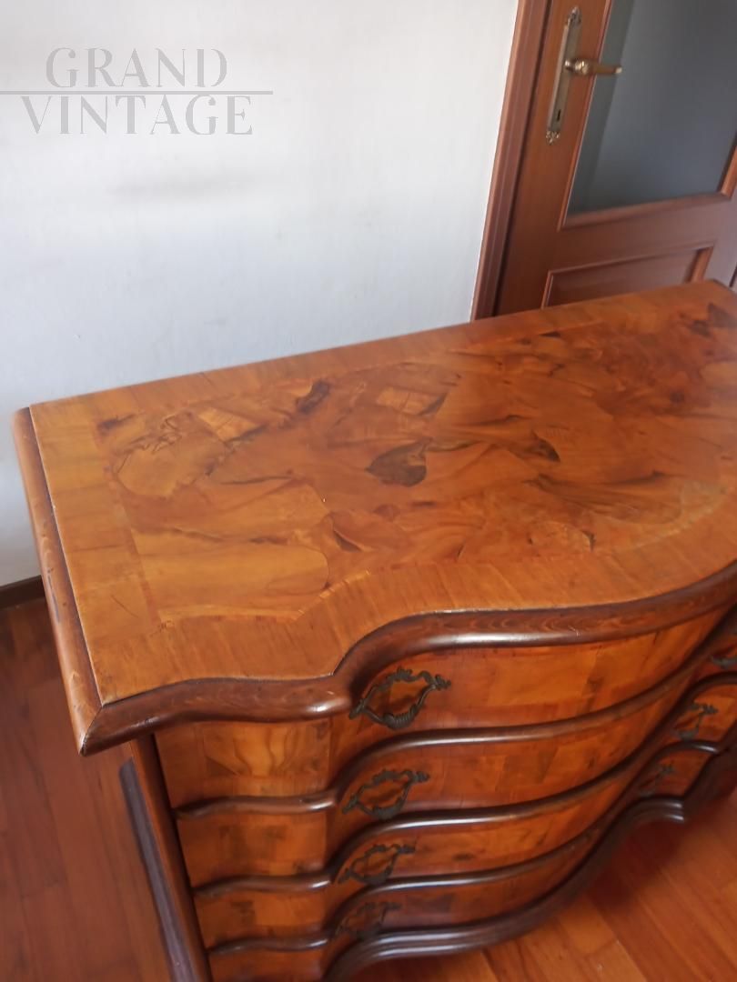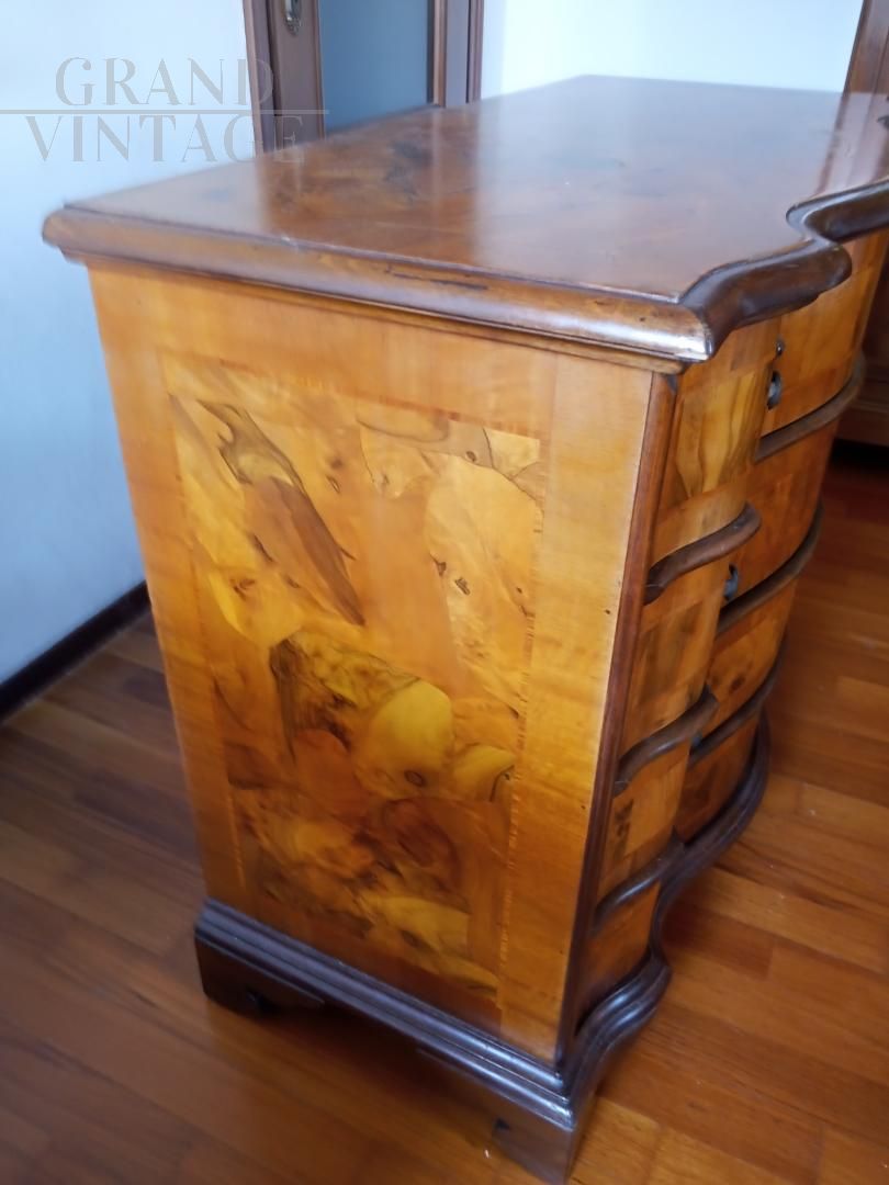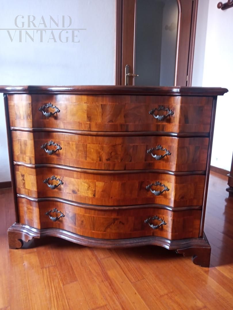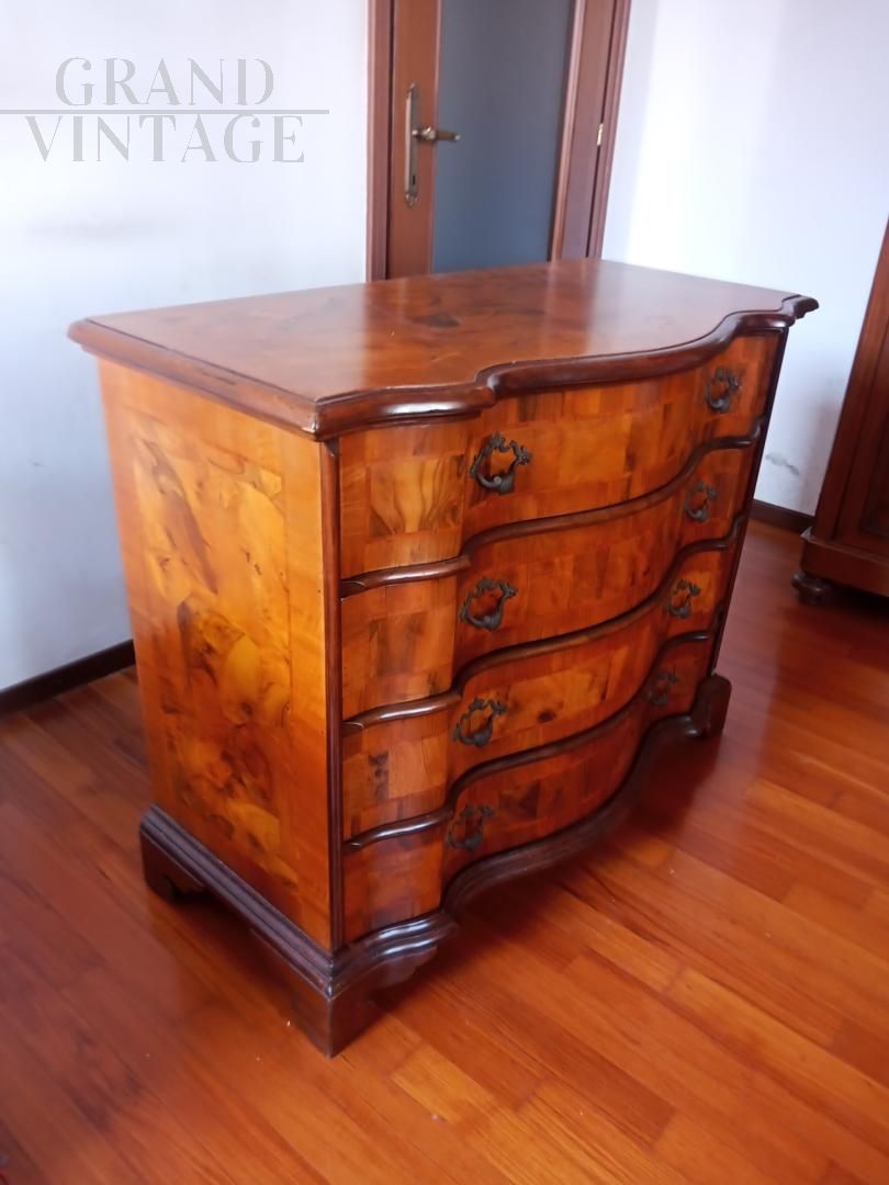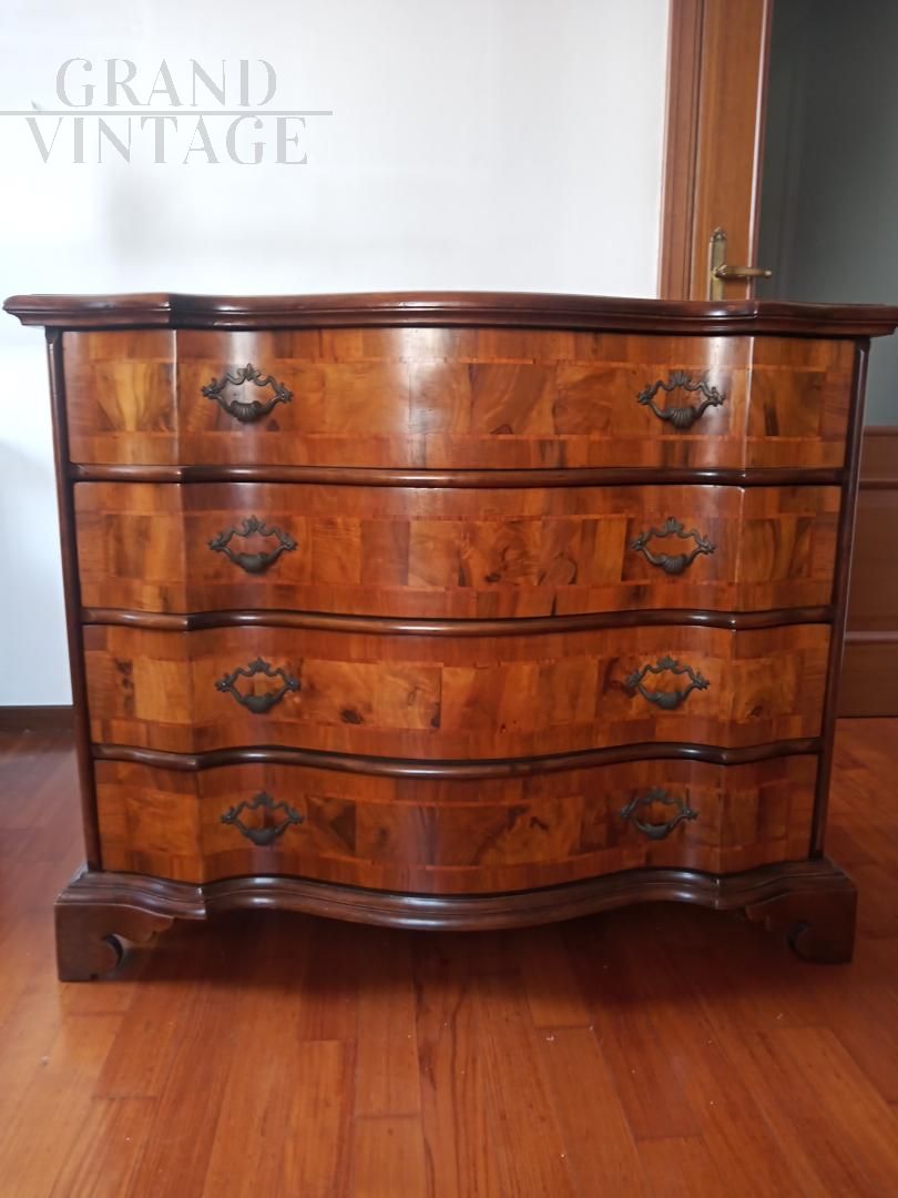 Antique baroque style chest of drawers in walnut briar with four very roomy drawers with an elegant wavy shape, made in Italy in the mid-1900s, the craftsmanship and the elegance of the finishes make this chest of drawers perfect for furnishing with class an entrance or a corner of both modern and style furniture. In perfect condition, it does not require any intervention or restoration.