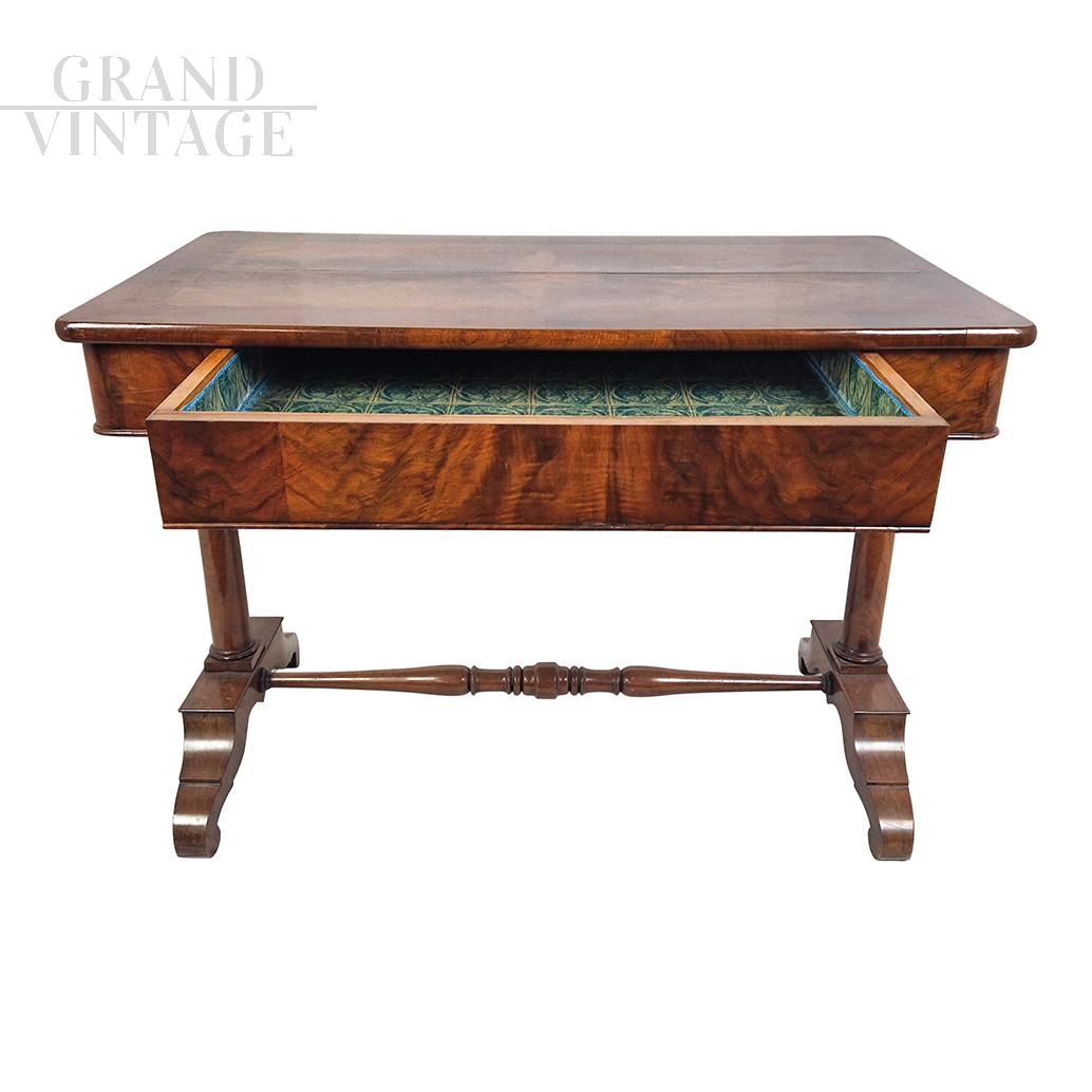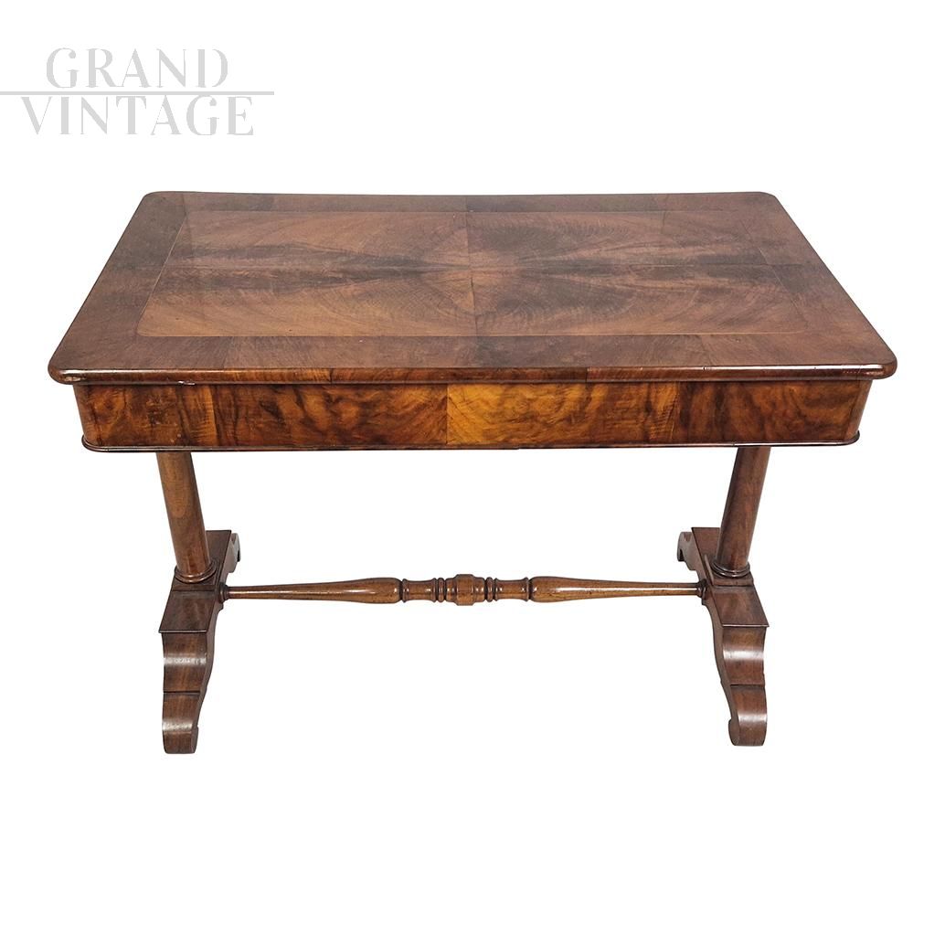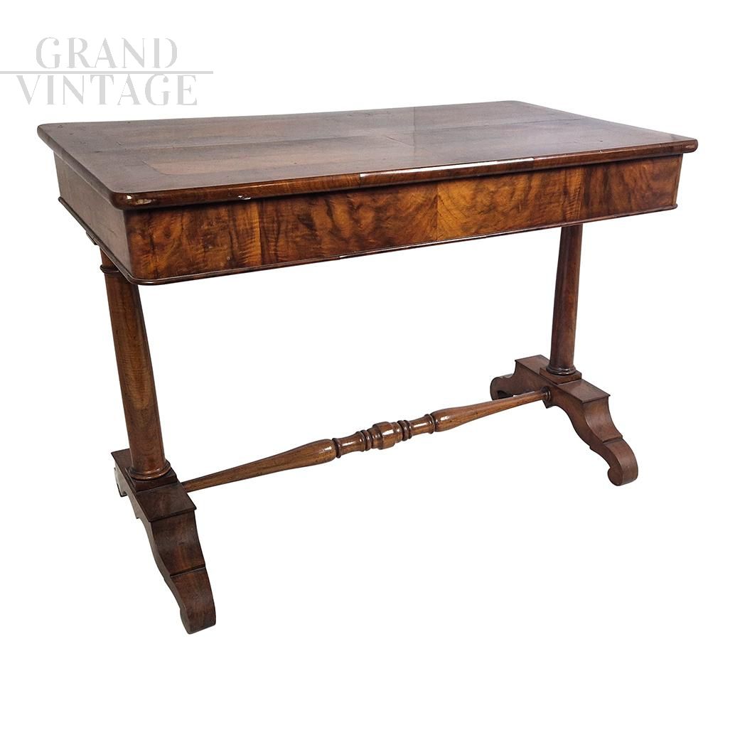 Antique writing desk from the Biedermeier era from the 19th century in walnut veneer and walnut briar, equipped with a drawer under the top.