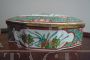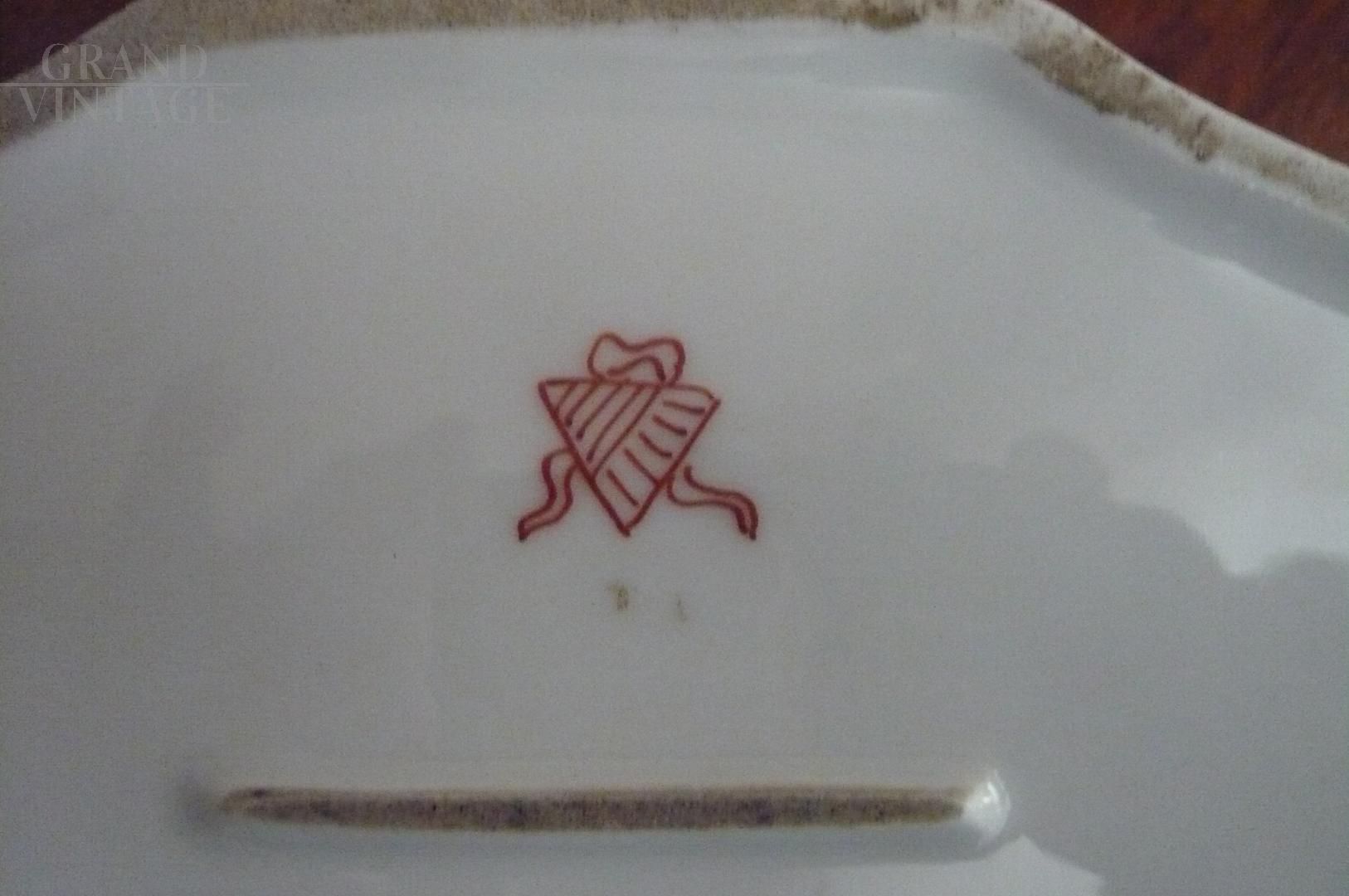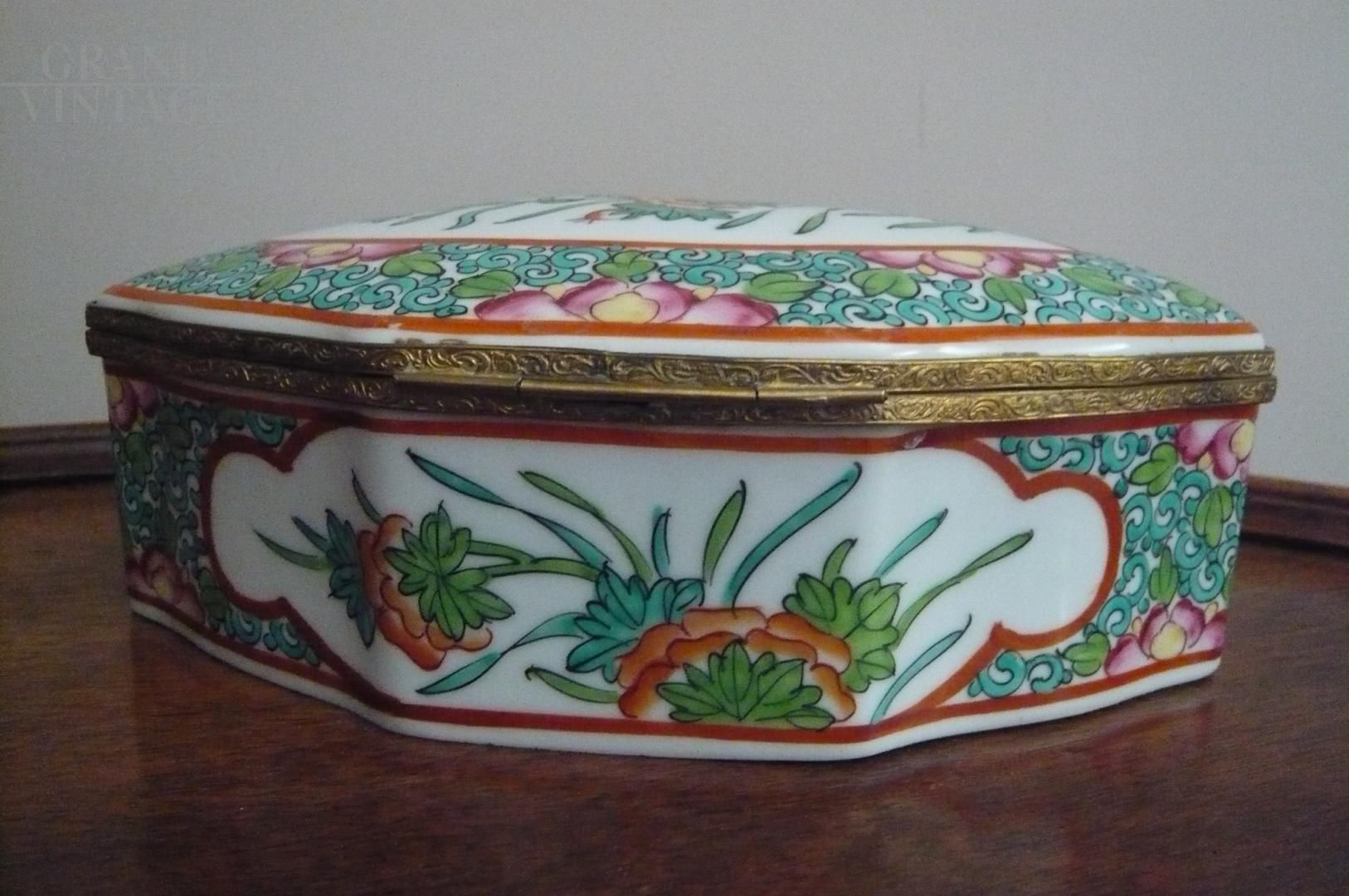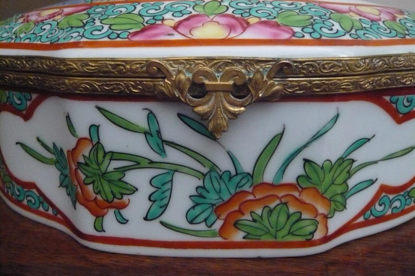 Large porcelain box from the Samson factory, Paris 1880, with a scalloped shape and decorations with Asian-style motifs. Napoleon III Japonism. Lid with lily-shaped brass closure. Bright and fresh colors on a white background, perfect condition.