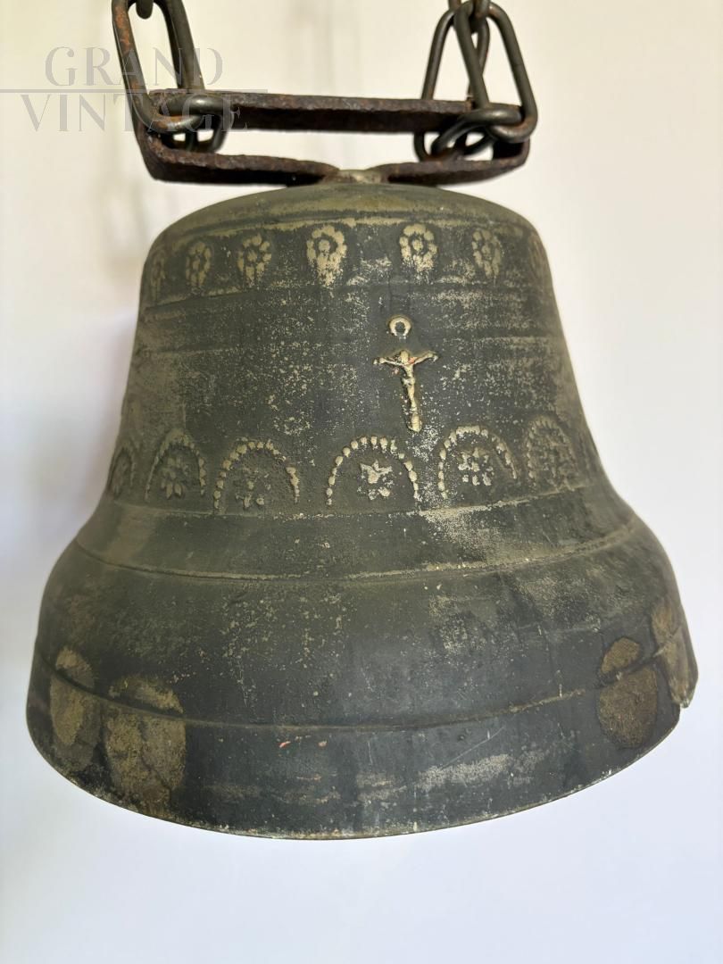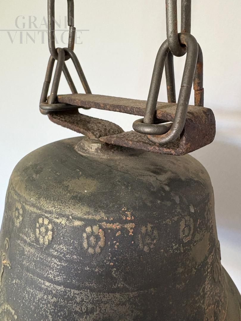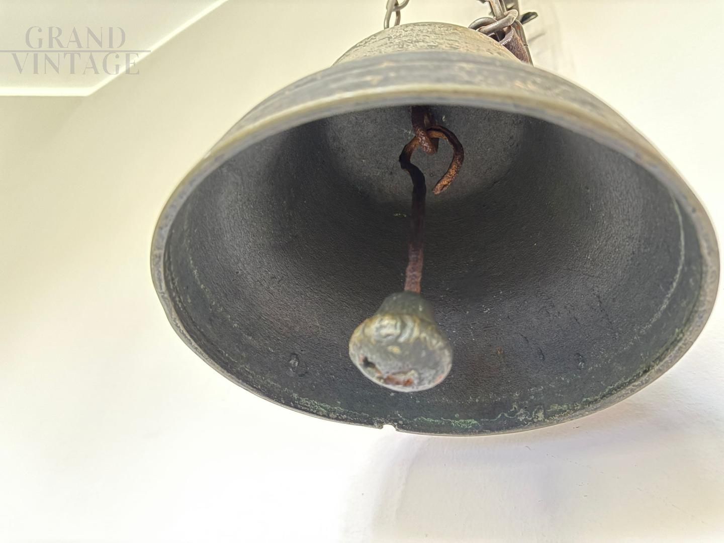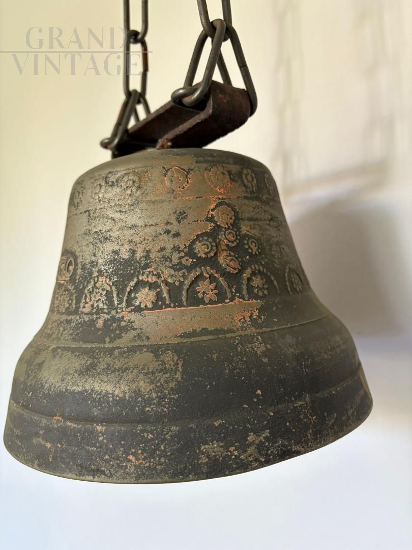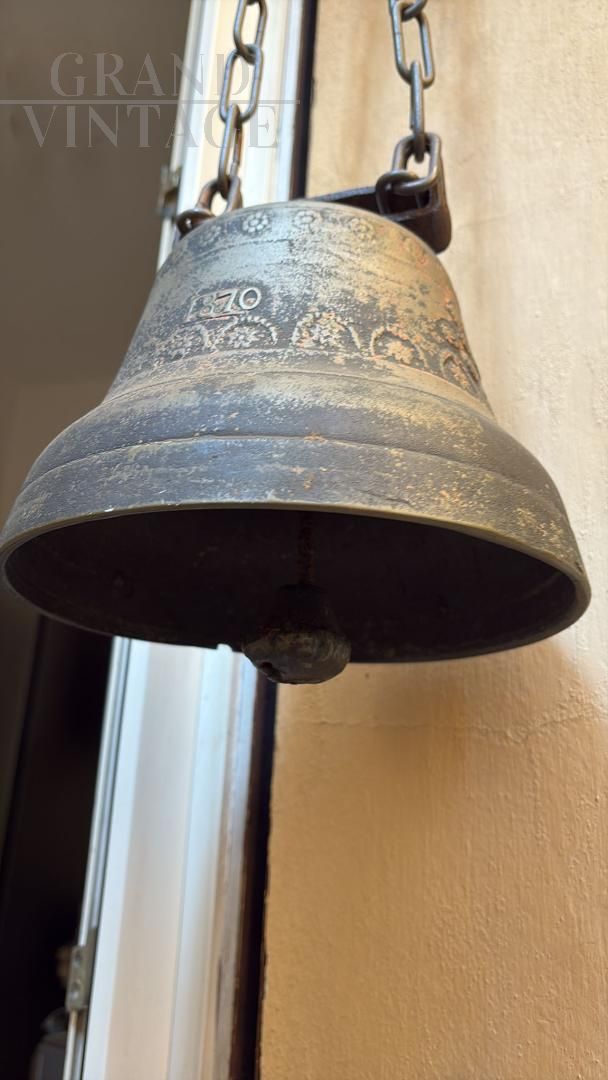 Campana originale antica in bronzo, datata 1870, realizzata in Italia. Presenta una raffinata decorazione floreale a rilievo e un’elegante patina naturale che ne testimonia l’autenticità e l’età. Pezzo storico dal grande fascino, ideale per collezionisti, ambientazioni d’epoca, giardini o spazi rustici. Solida e ben conservata, rappresenta un raro esempio di artigianato ottocentesco italiano.