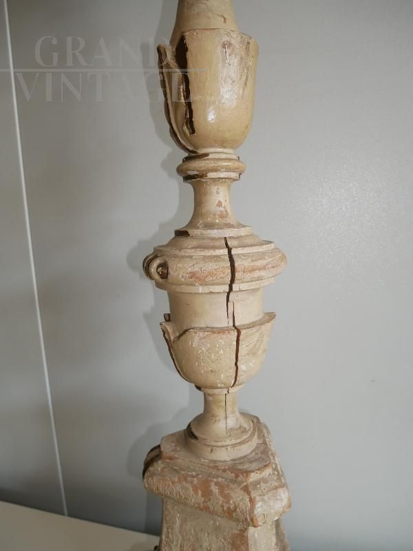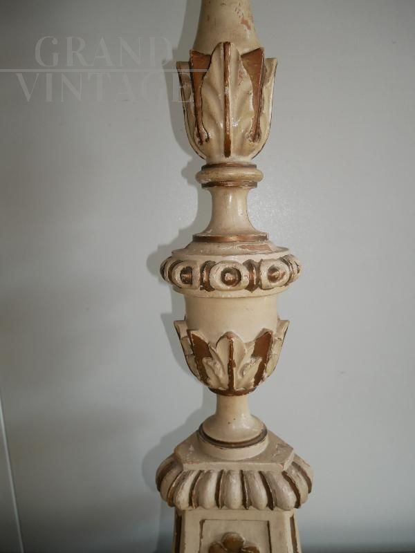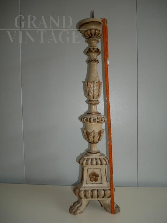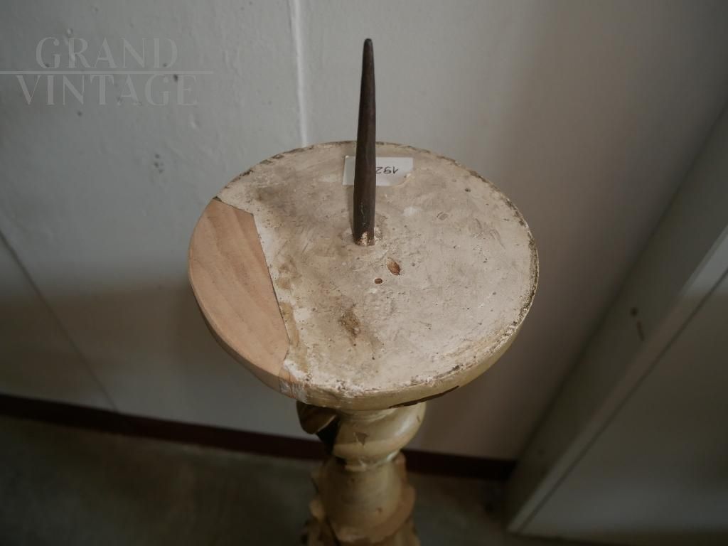 Large antique carved, lacquered and gilded candlestick from Italy from the 19th century, in excellent condition, it has a visible restoration: a reconstructed lack.