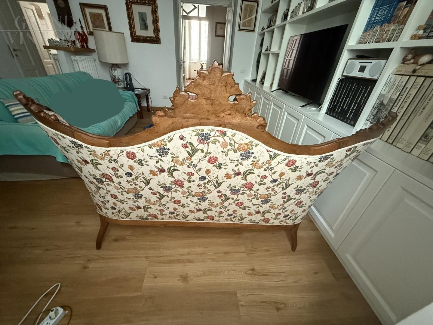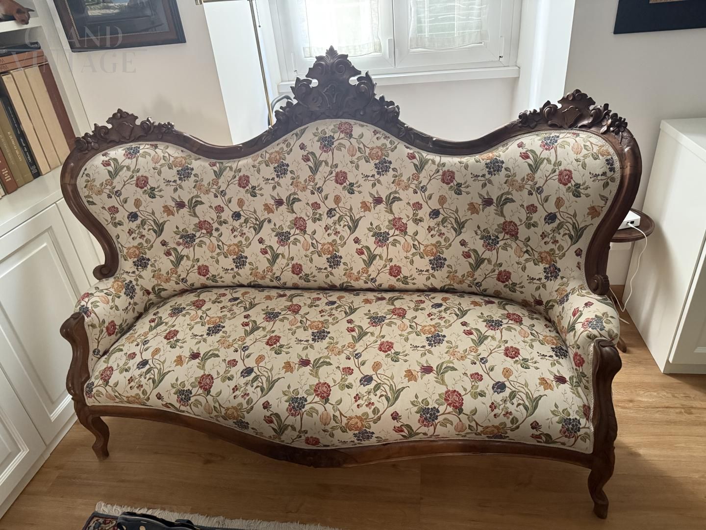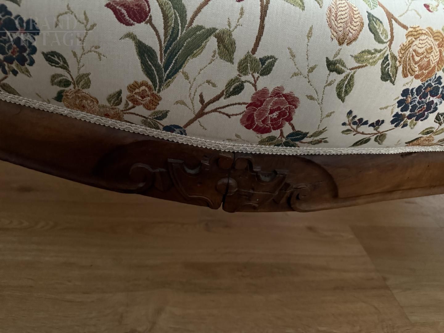 Antique carved sofa in floral fabric