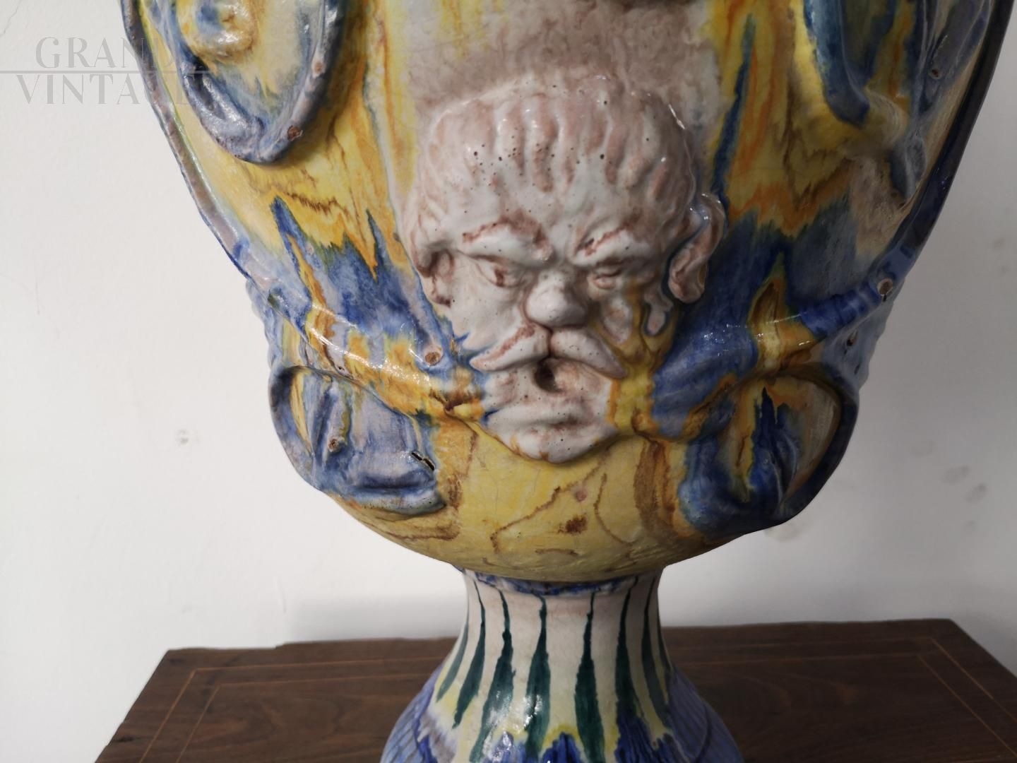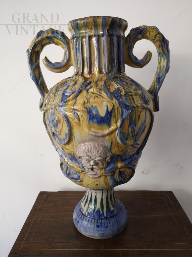 Antique ceramic amphora from Caltagirone, Italy from the mid-19th century depicting the mask of a satyr, decorated on one side only.