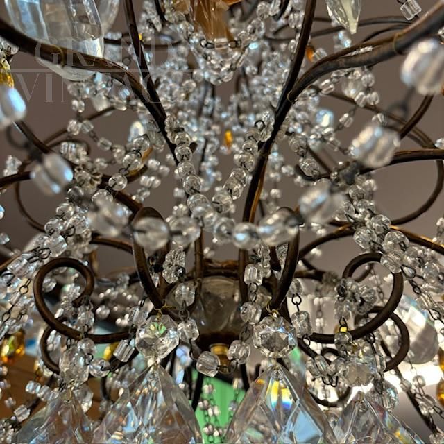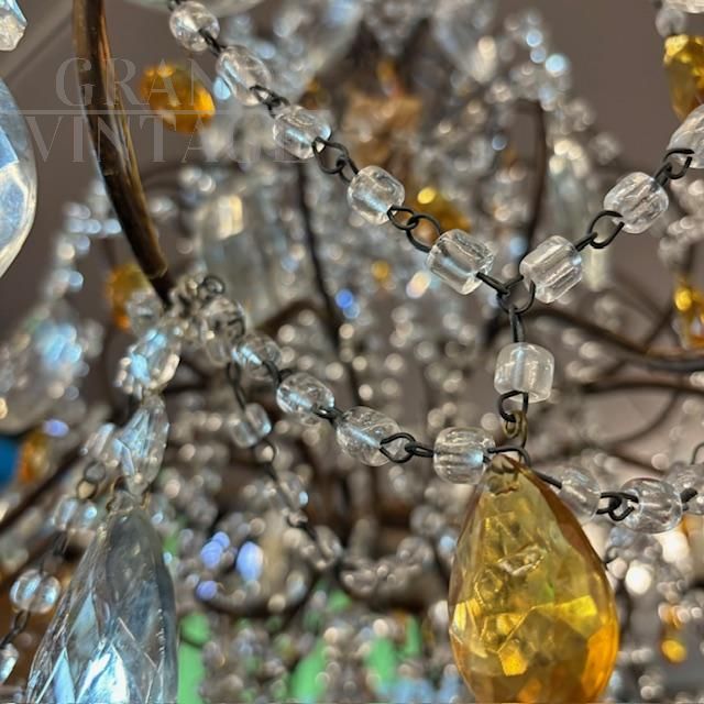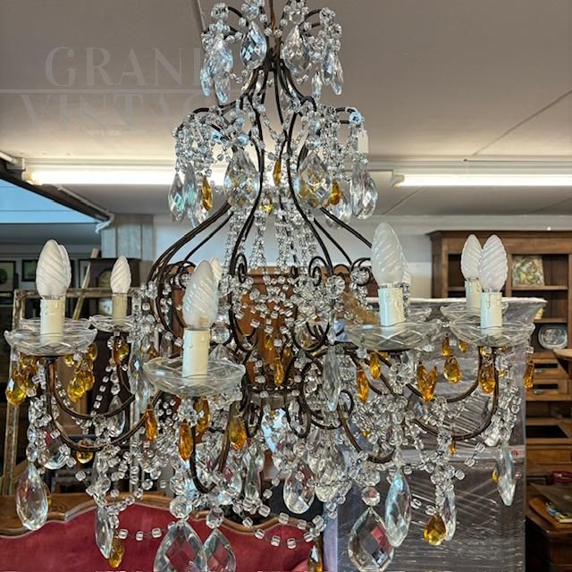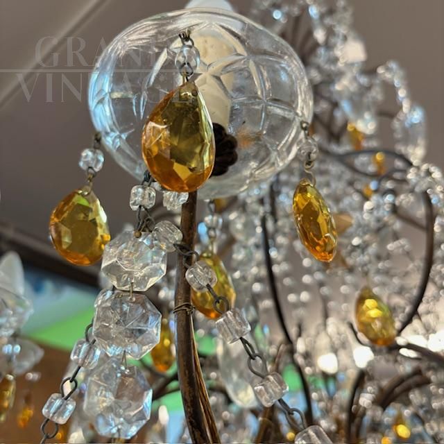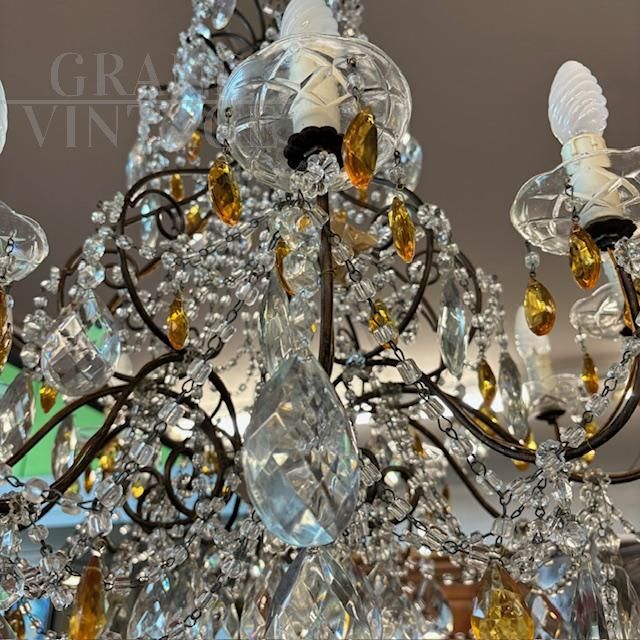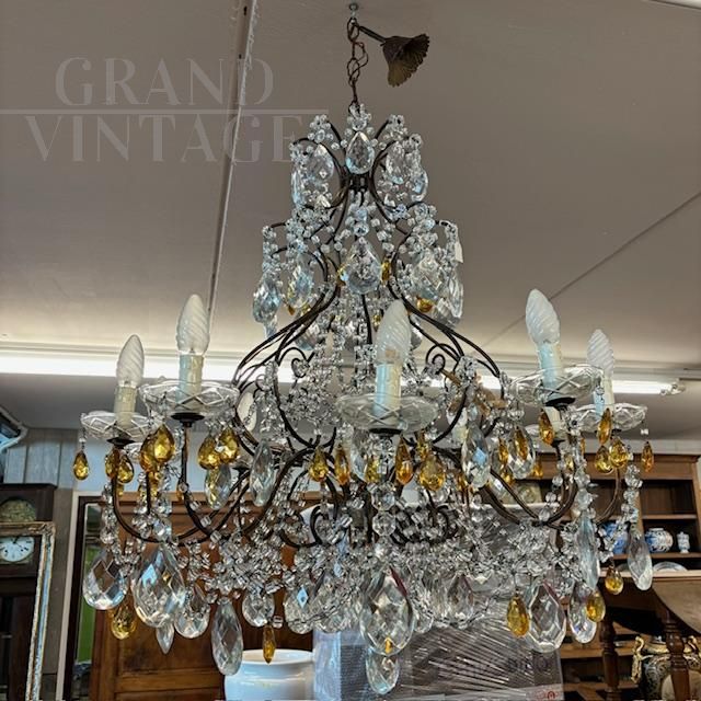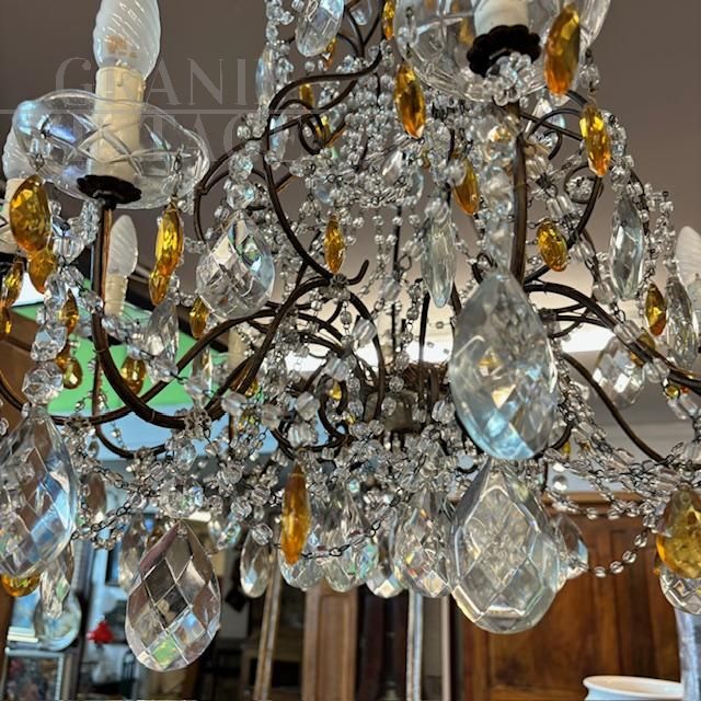 Antique and beautiful chandelier with transparent and amber-colored crystal drops, with 10 light points arranged on several levels, with electrical system.