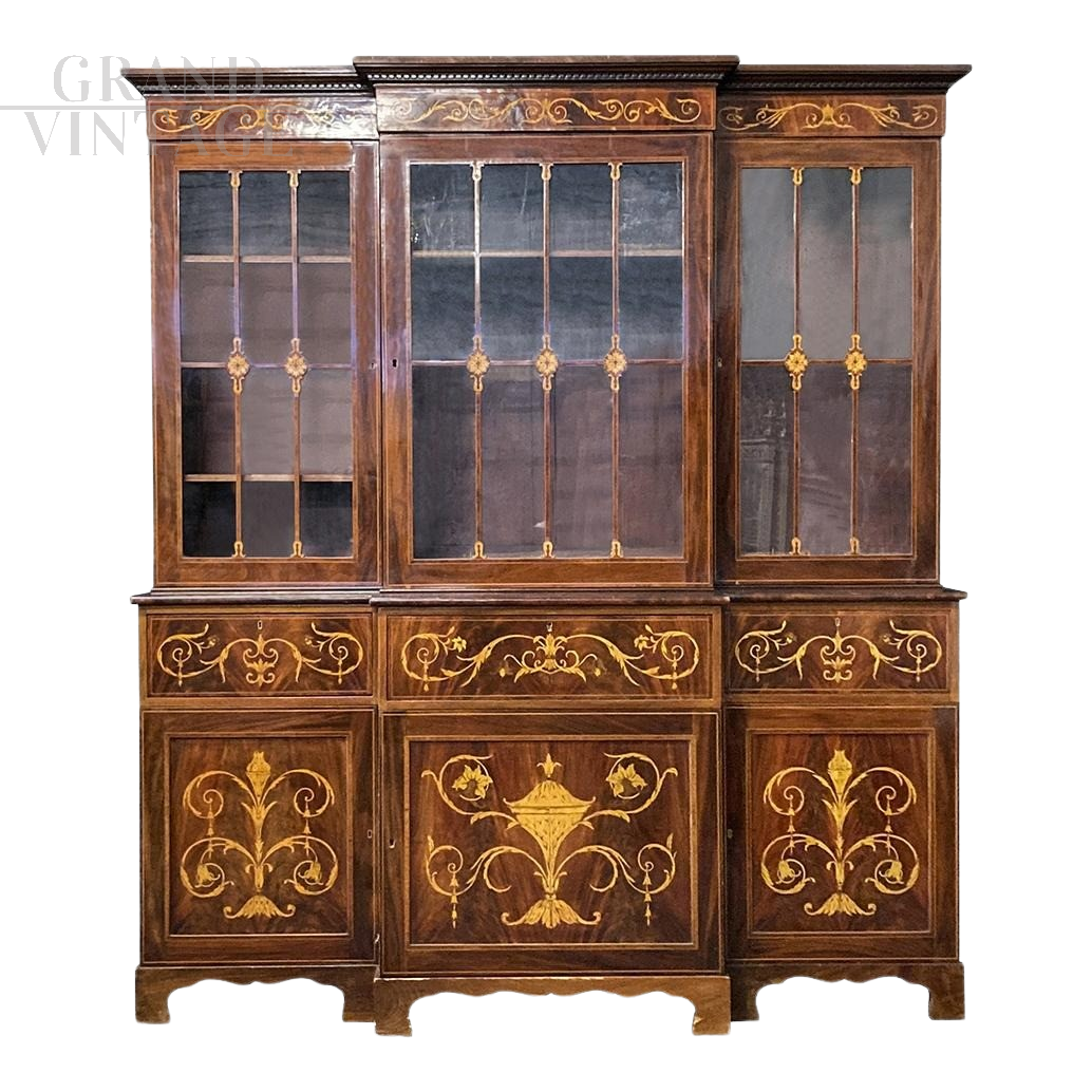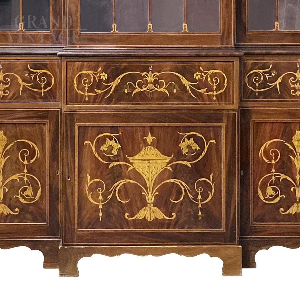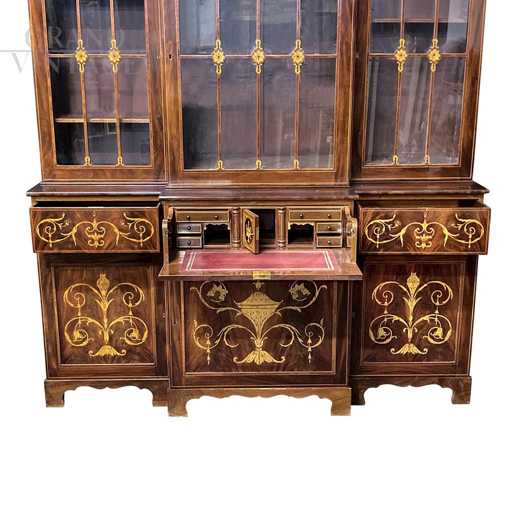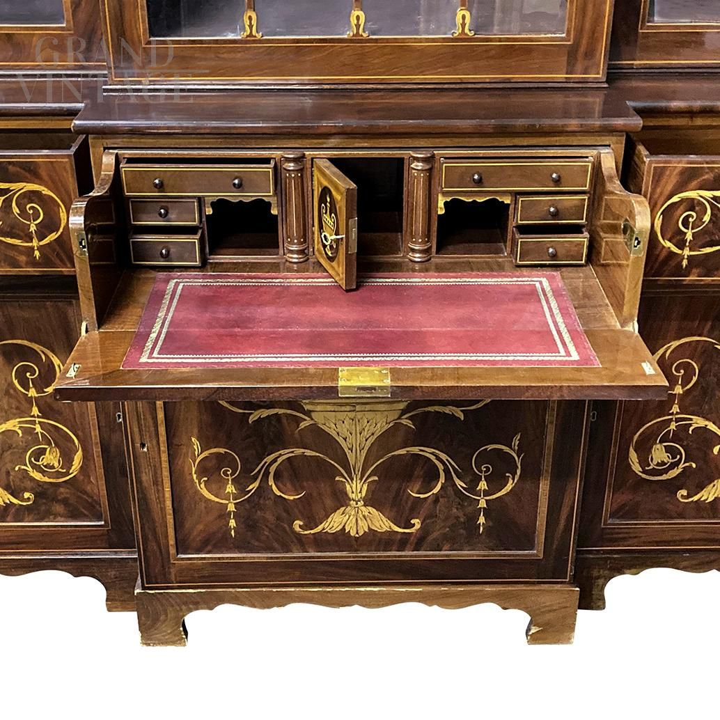 Elegant antique English Charles X bookcase in mahogany with precious maple inlays; the upper part has a display cabinet, the lower part has drawers, doors and a folding desk, early 19th century England.