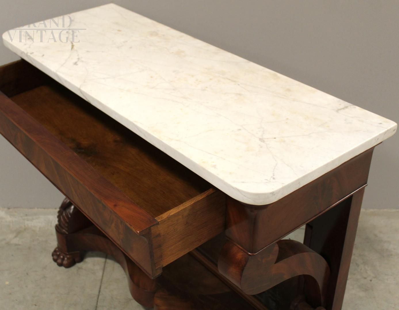 Antique Charles X console in mahogany with white Carrara marble top and original mercury mirror.