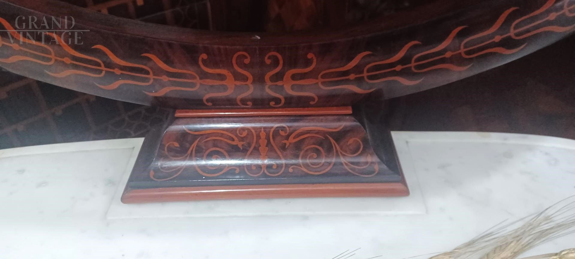 Magnificent antique French dressing table in the Charles X style, first half of the 19th century, in richly inlaid mahogany feather with marble top, drawer under the top and tilting mirror with inlays and carvings. To be restored according to taste.