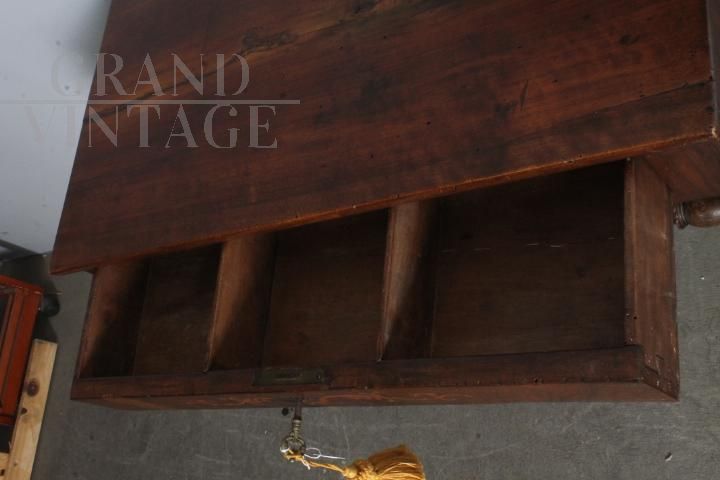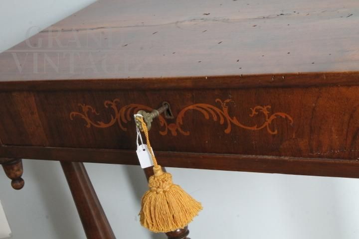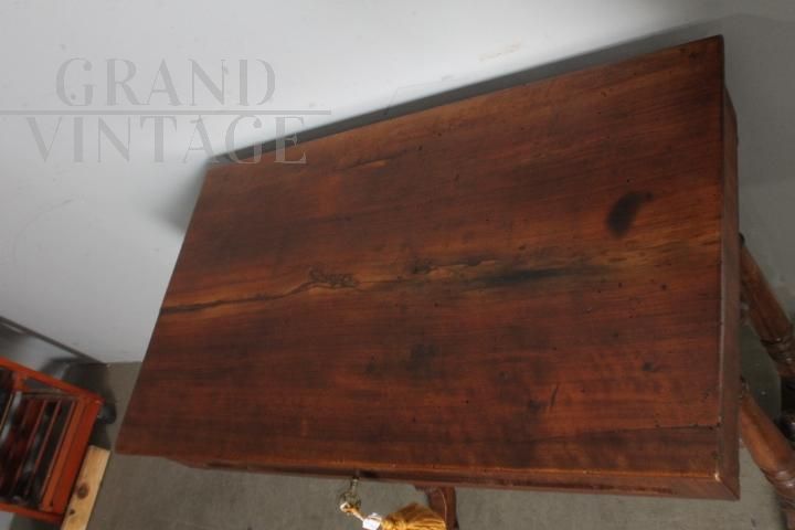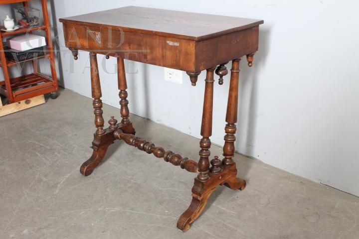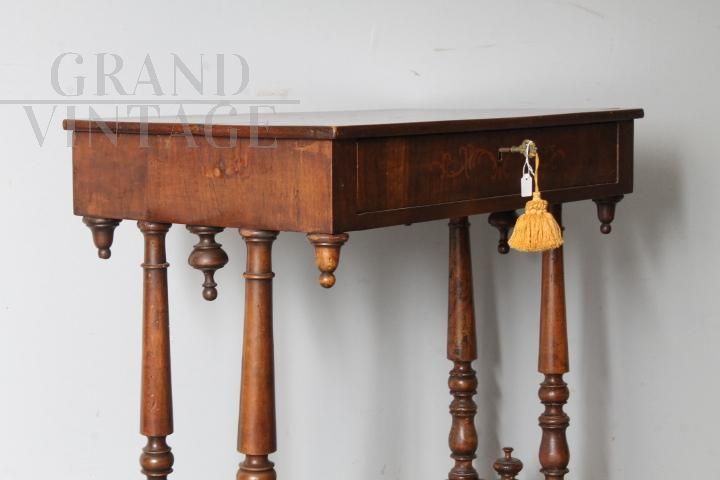 Small antique coffee table, console or writing desk from the Charles X period - 1830, made of solid walnut with finely turned legs and a large central drawer with maple inlay. In good condition, not restored.