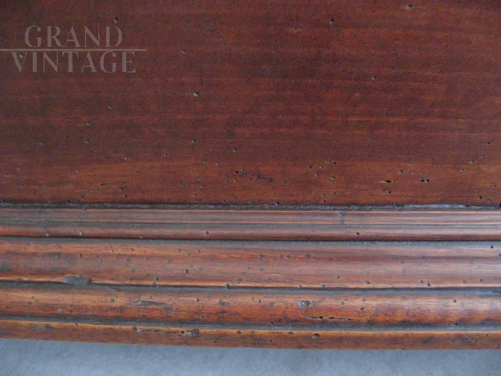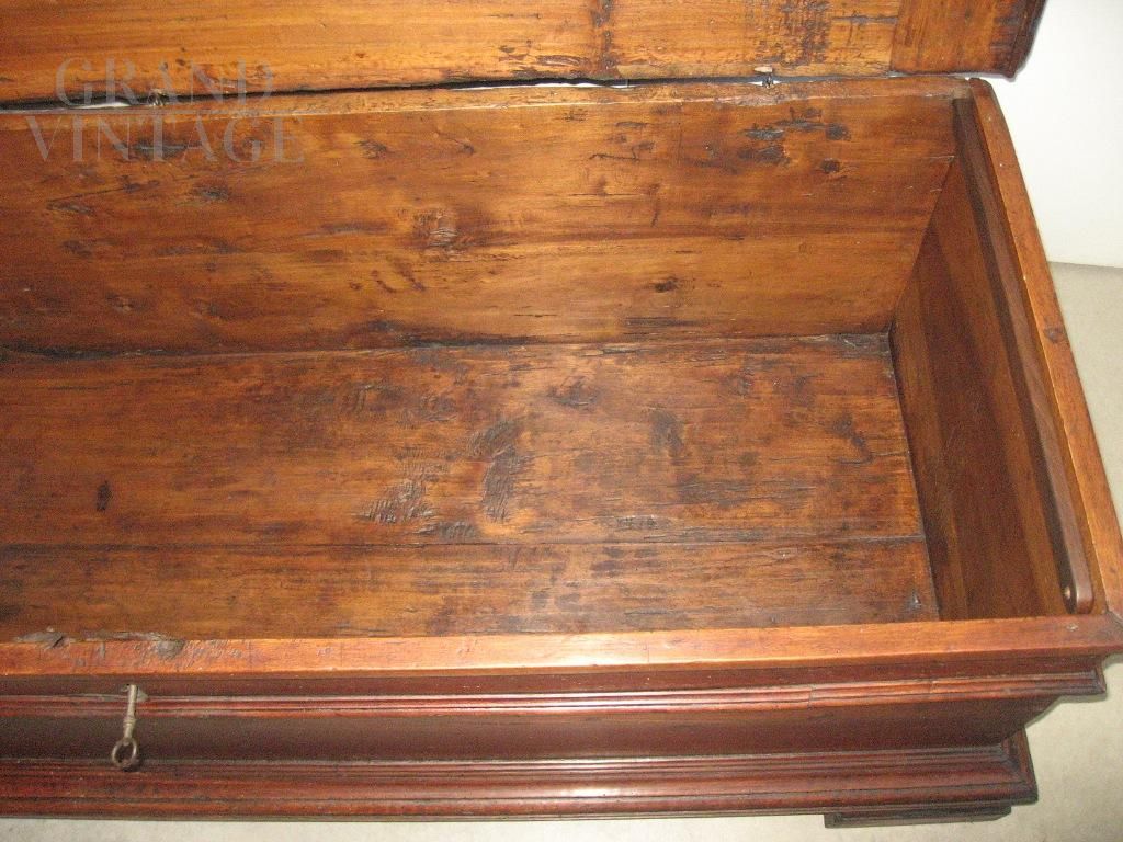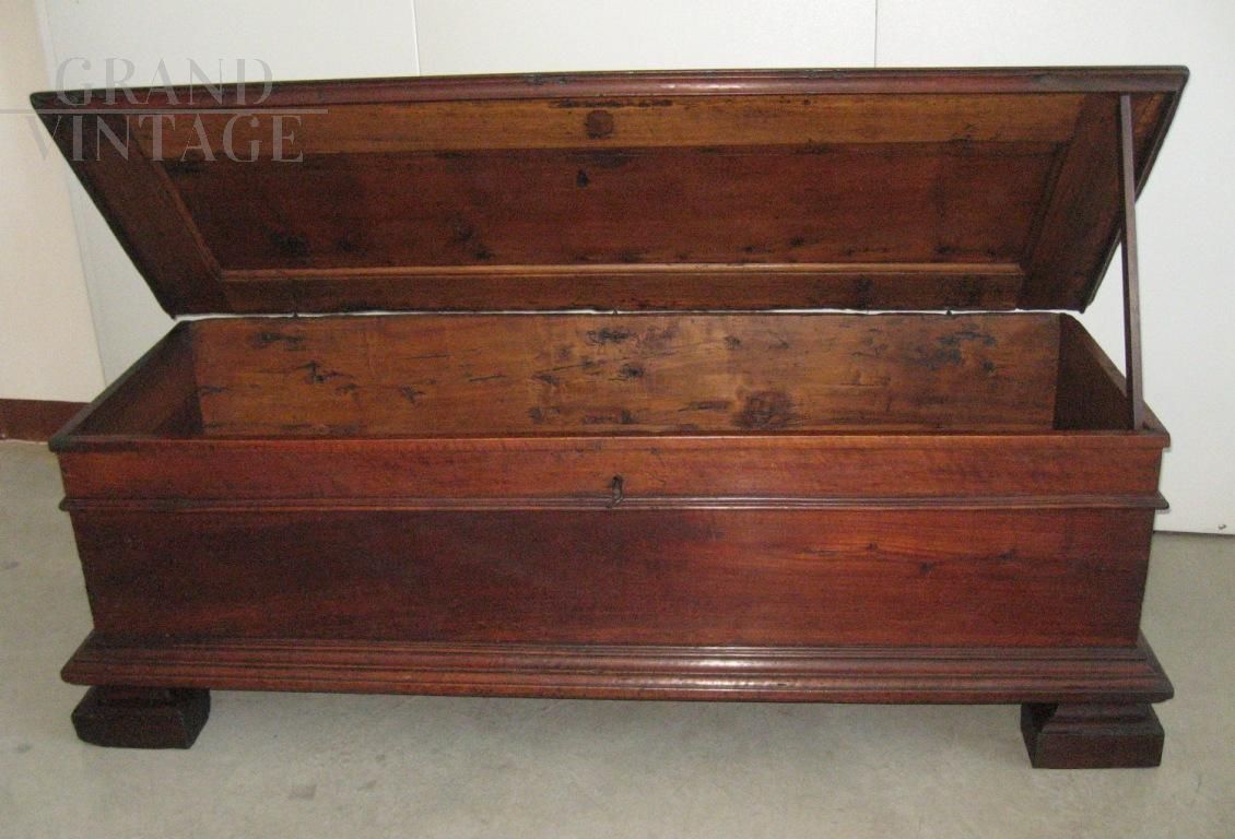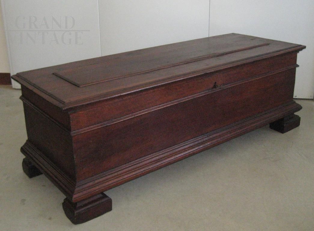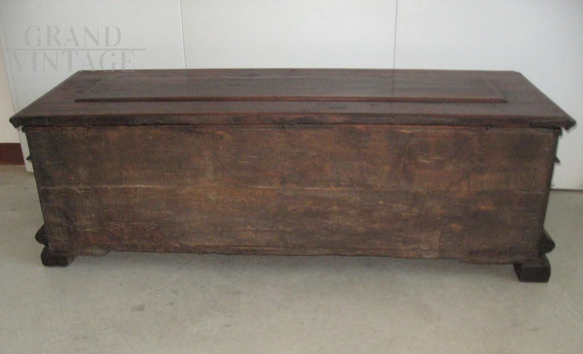Beautiful antique chest from the 17th century in walnut wood, made in the Italian Bolognese area, with the typical walnut veneer top and panel in the center. The feet are "brick" type, and the lock is original but not working. The chest has been recently restored with a conservative restoration and with anti-woodworm treatment done.