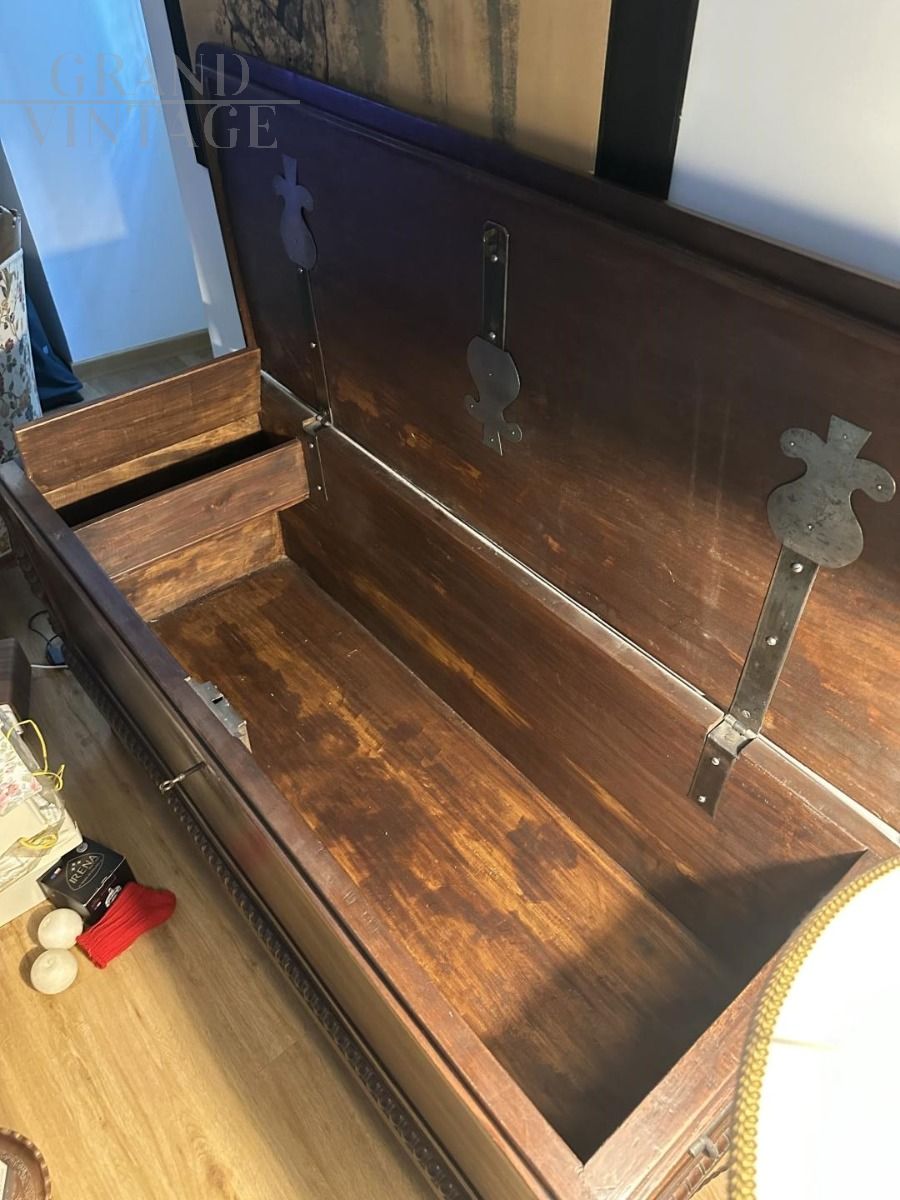 Antique chest from the early 19th century in walnut wood with carved corners, completely restored and treated with beeswax, it retains the natural traces of time as shown in the photo. It does not have any worm holes.