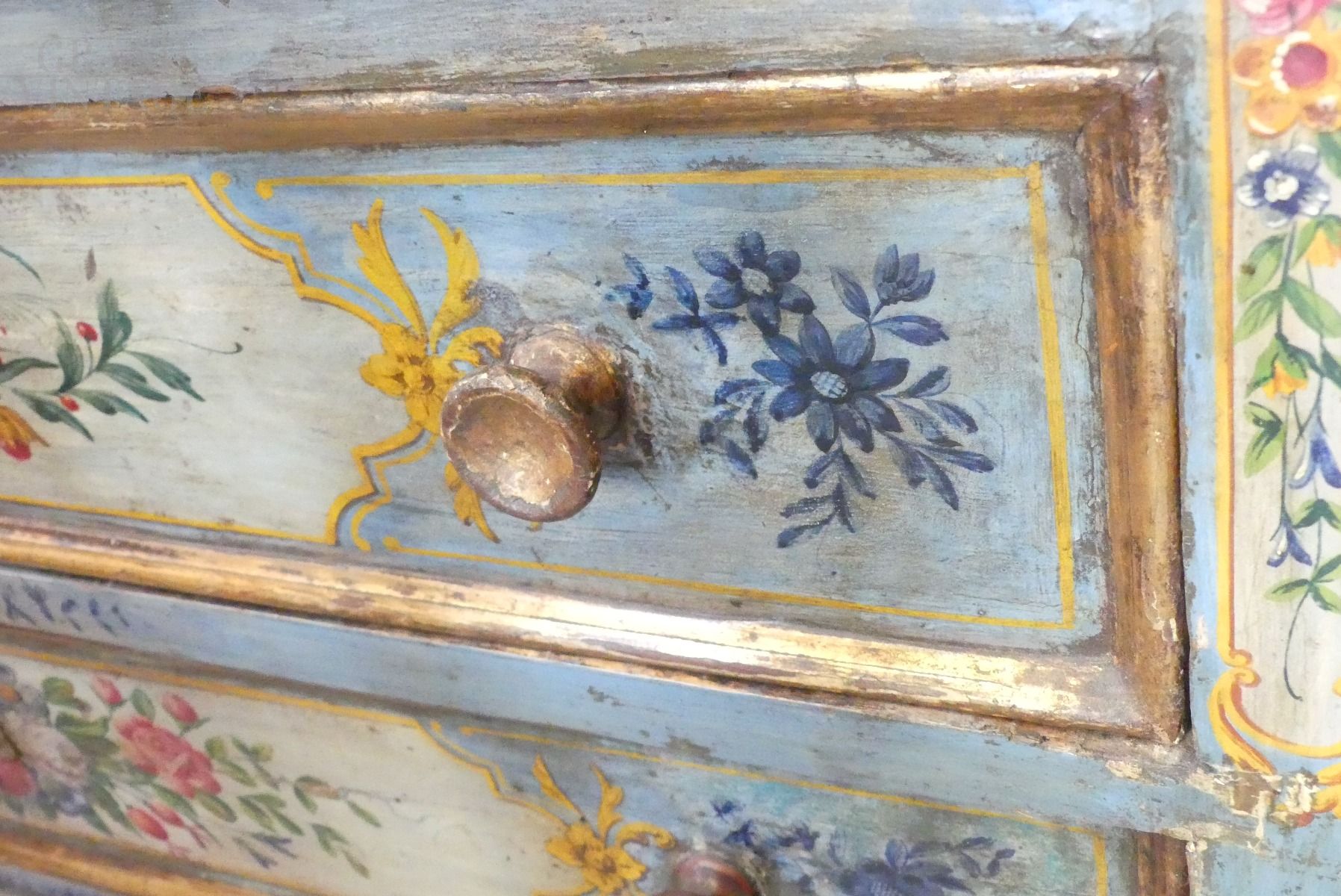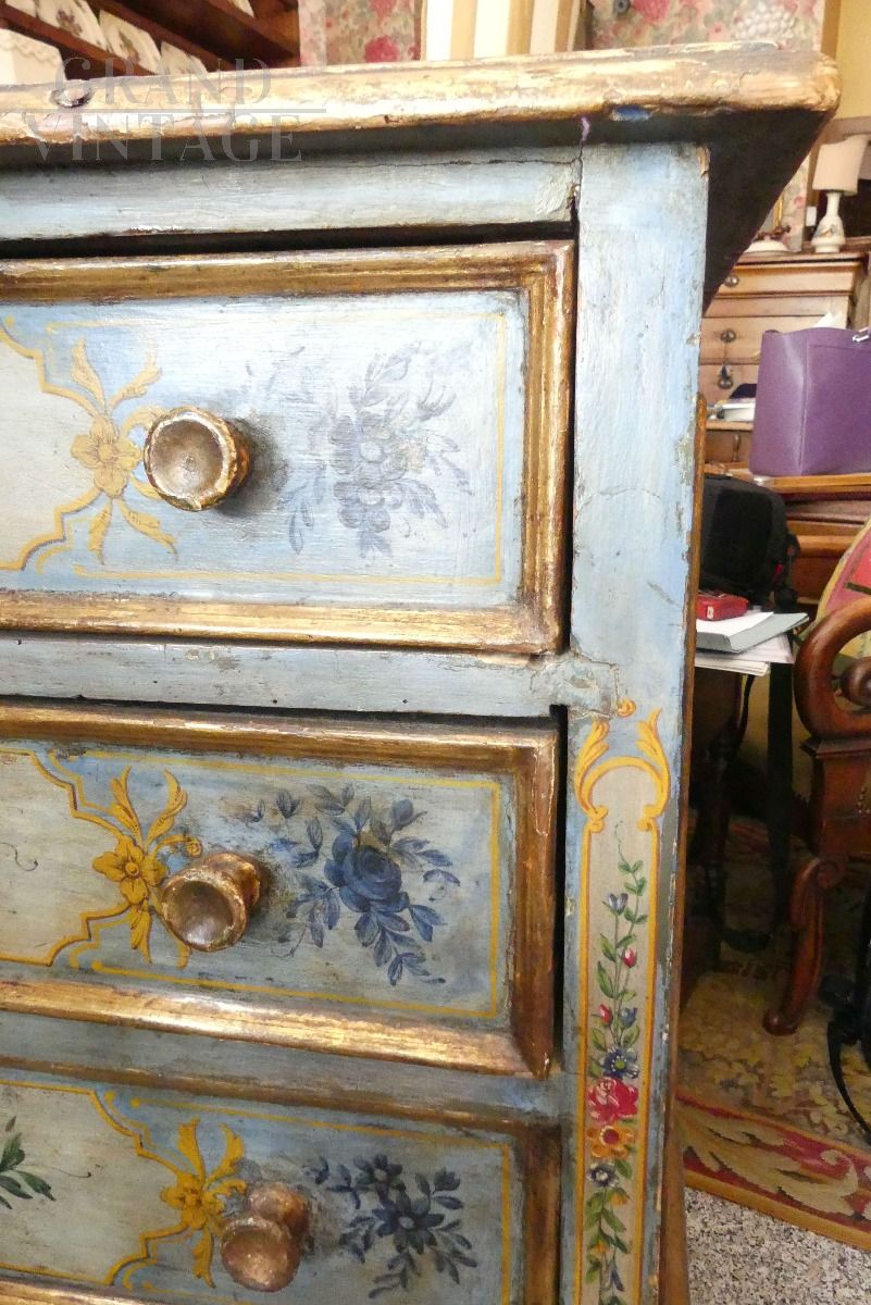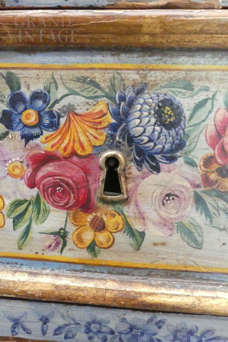 Antique flower-painted dresser with real gold leaf profiles, from the end of the 17th century, with all different painted drawers. The chest of drawers is also richly painted on the sides and on the top.
