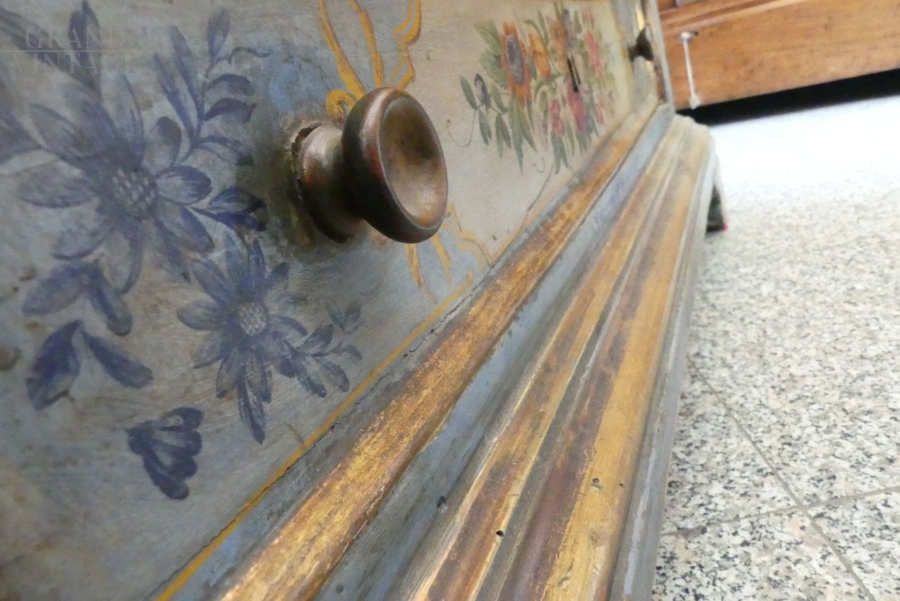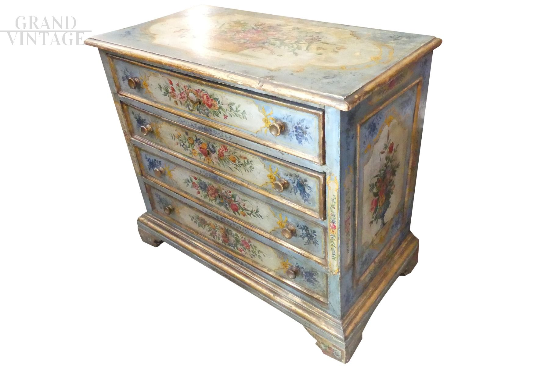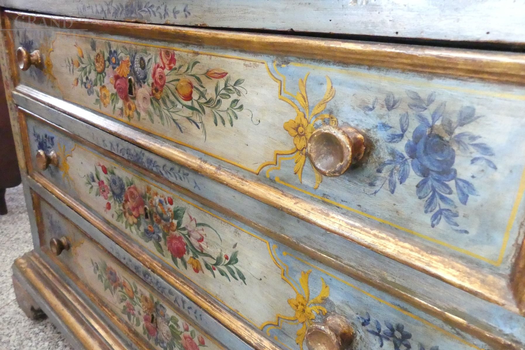 Antique flower-painted dresser with real gold leaf profiles, from the end of the 17th century, with all different painted drawers. The chest of drawers is also richly painted on the sides and on the top.