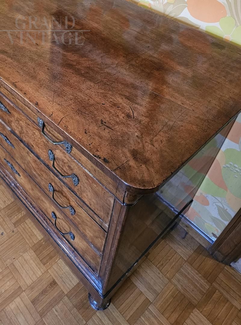 Antique 17th century chest of drawers in fine walnut and walnut briar, equipped with 3 deep drawers plus a drawer in the upper part of the furniture. The drawers are of excellent workmanship and in excellent condition. Intact and perfectly stable structure, which rests on four onion-shaped feet. Upper support surface in excellent condition and with original finish, it is probably a single plank. Intact wood with no obvious signs of deterioration.