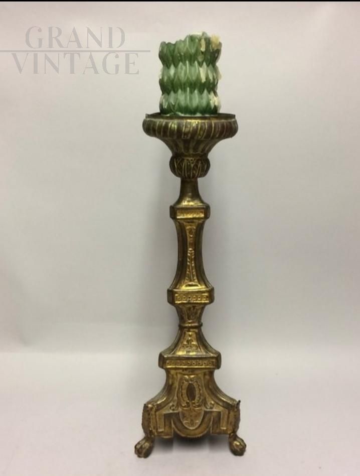 Antique church candlestick in finely chiseled and gilded bronze, from a family chapel in France. The decoration represents a monstrance, the base rests on 3 claw-shaped feet.