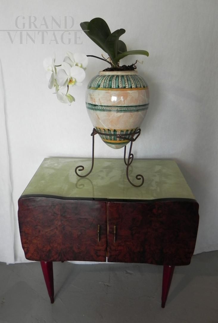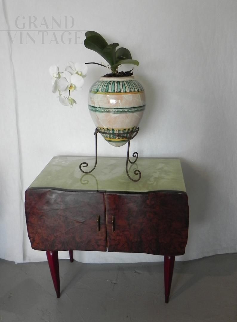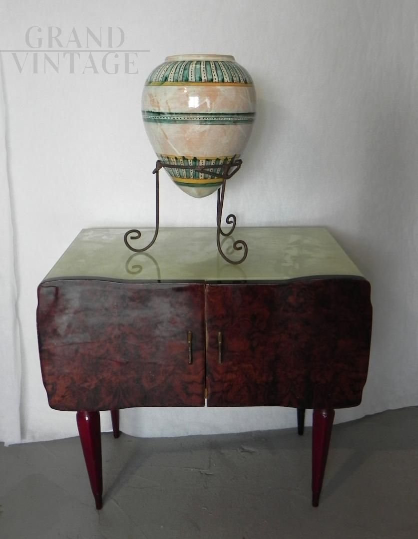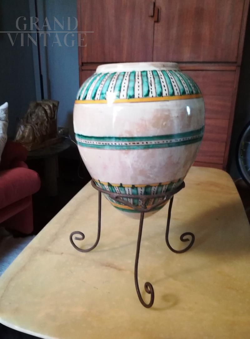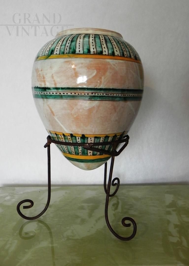 Beautiful large amphora-shaped vase in glazed and hand-decorated ceramic in classic style, with iron support. The vase is painted with geometric patterns on a pink marble effect background, and is also vitrified inside. Height with support 39 cm.