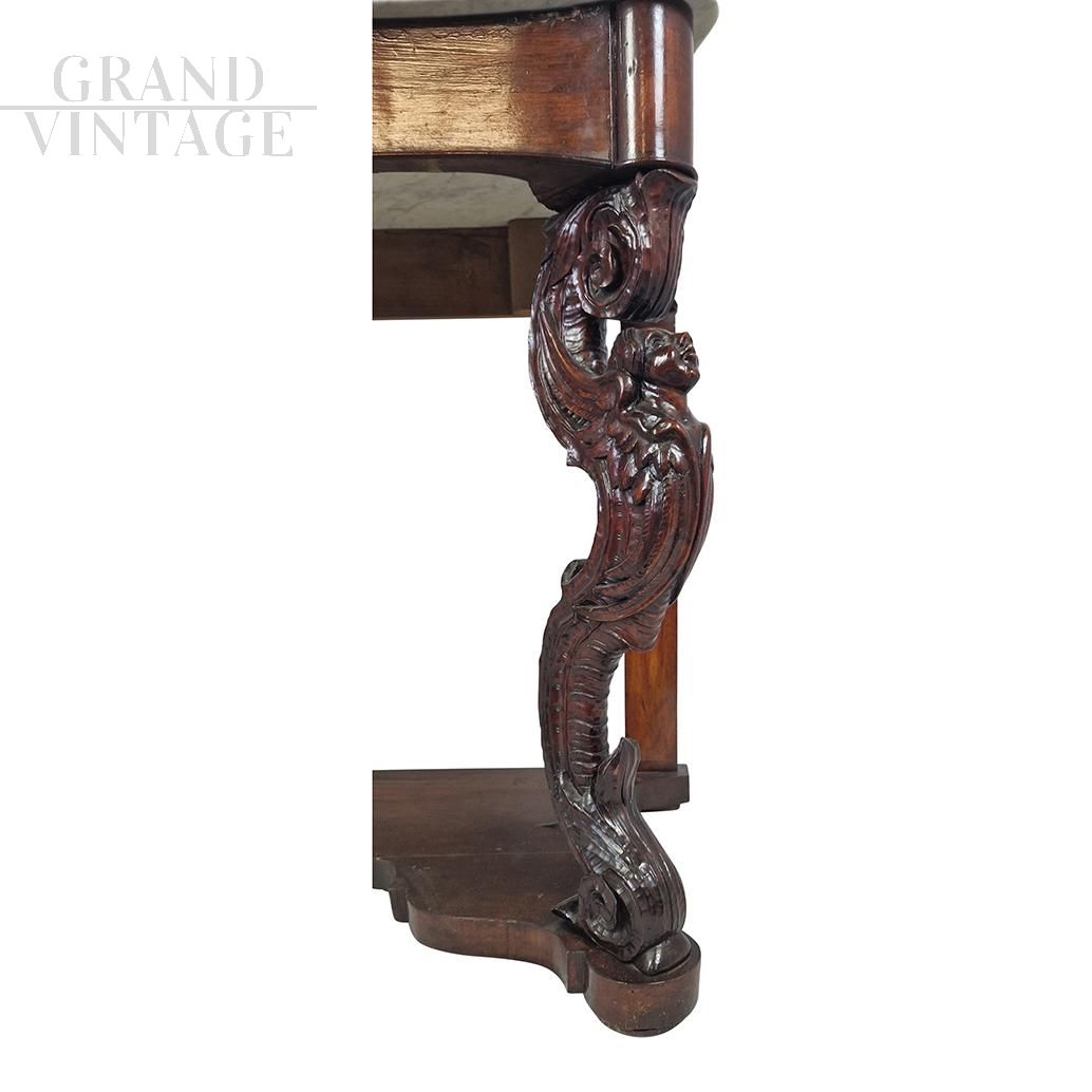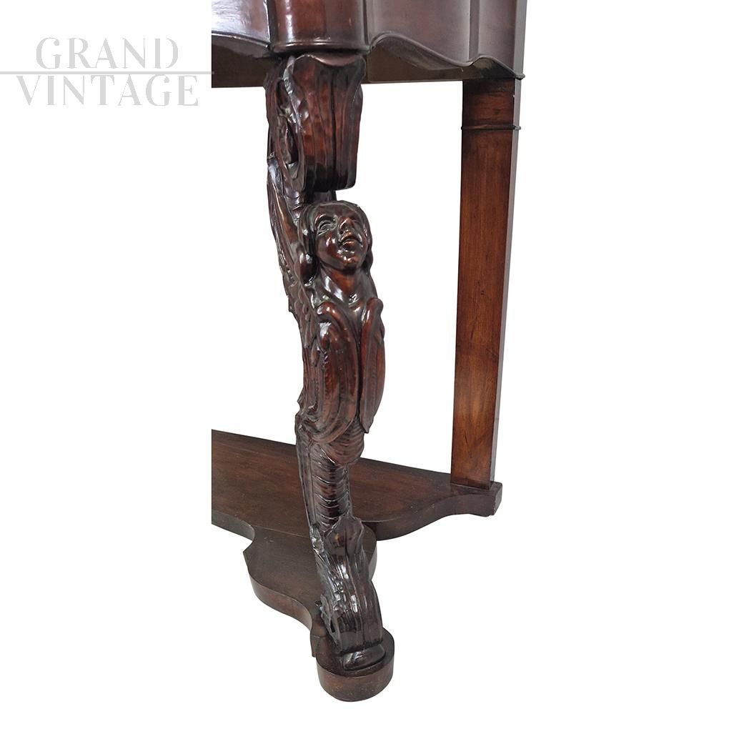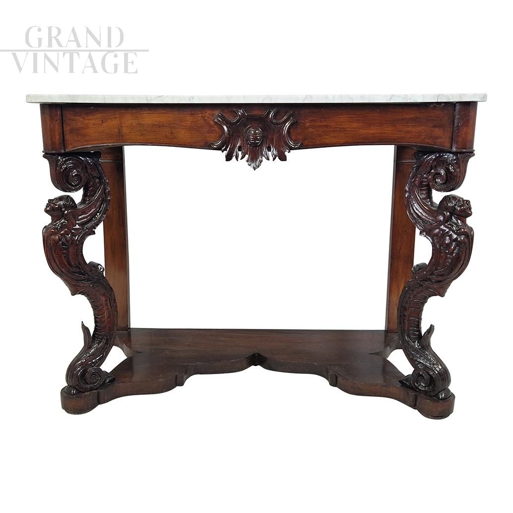 Antique console from the Louis Philippe era, 19th century Italy, in carved wood and decorated with a motif of volutes, the beautifully moved legs feature caryatid sculptures, the shaped top is in white Carrara marble.