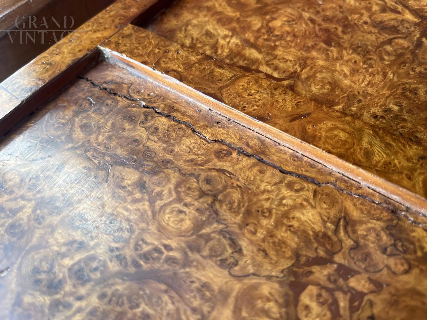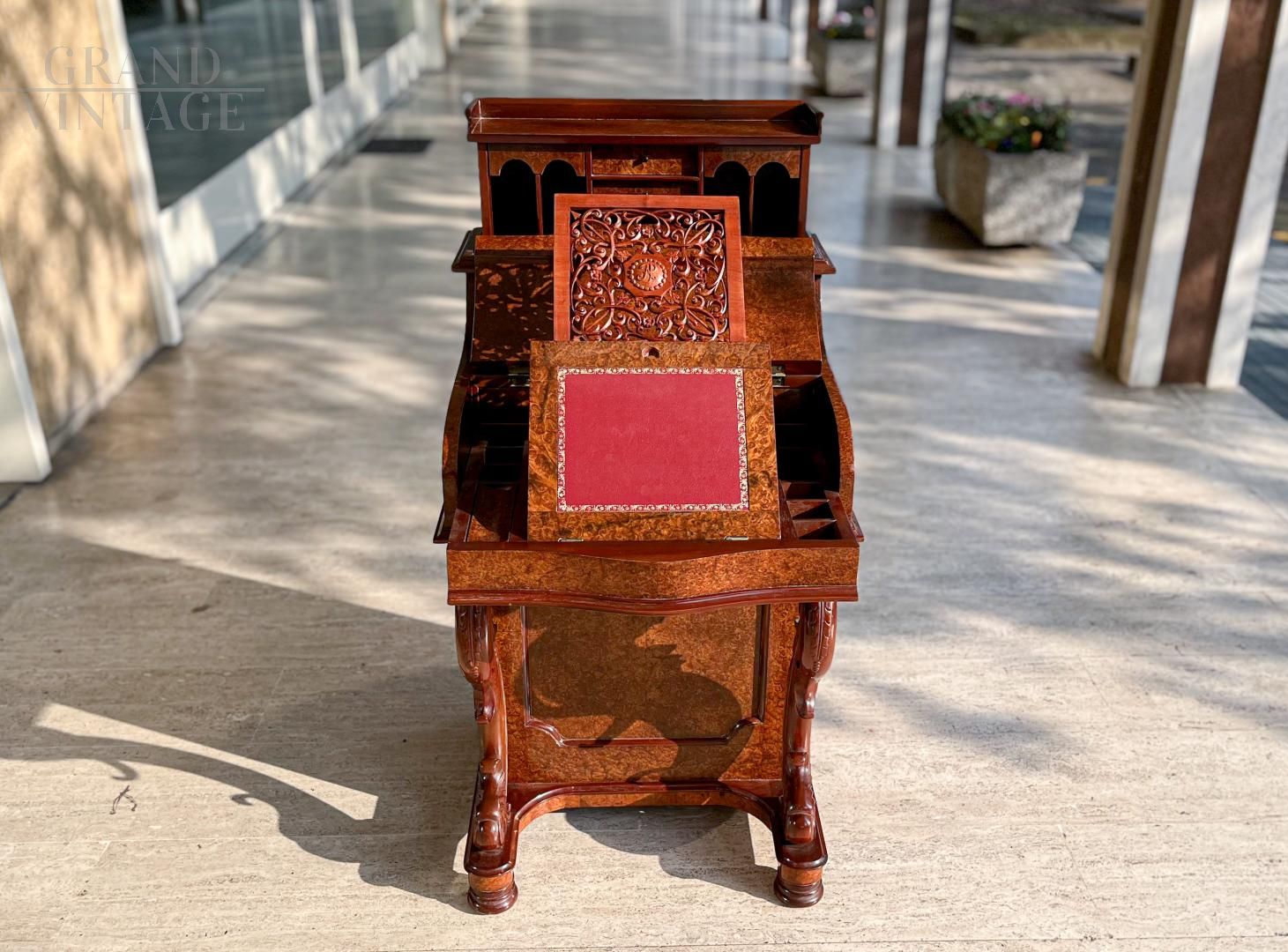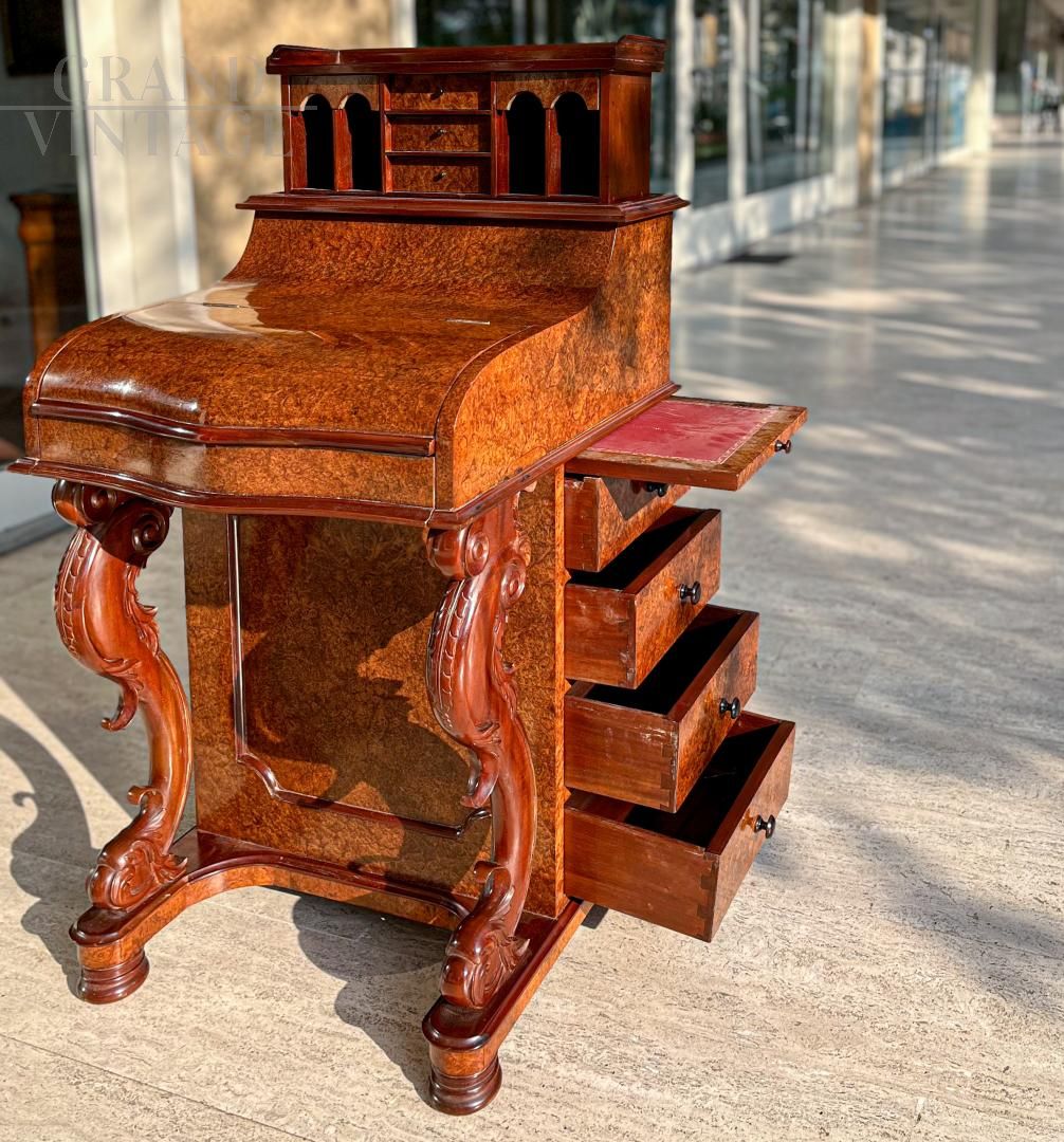 Beautiful late 19th century Davenport desk in Thuia briar with red leather top desk with gold finishes, lectern with initials and various hidden drawers. The side drawers on the left can be opened with a red leather tray for pens and ink, while the drawers on the right are beautiful. Retractable upper part via a lever hidden between two drawers. The desk is in the center as it is finished on all sides, it is restored and has a really interesting price.