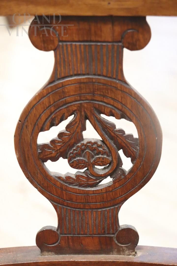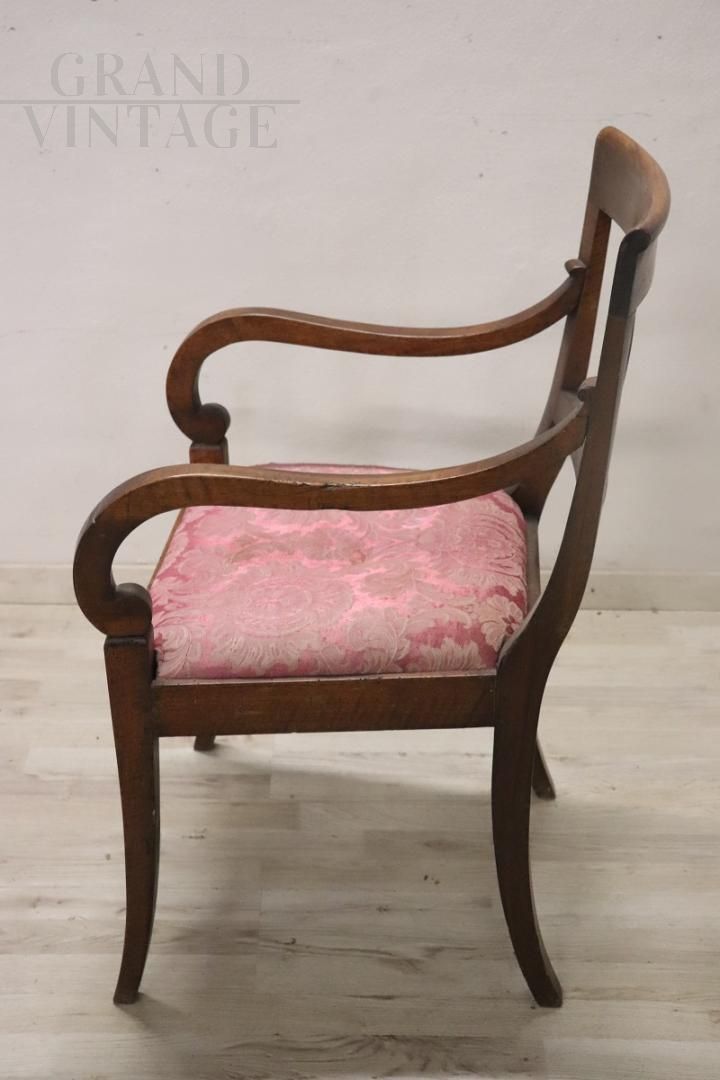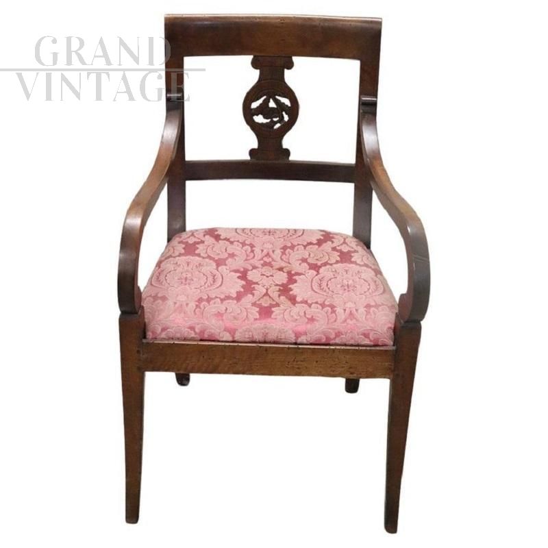 Beautiful antique Italian armchair from the Directoire period of the late 18th century in solid walnut wood with carved backrest. The armchair is very elegant. The backrest decorated with classic carving is beautiful, note the two important curled armrests. The seat is padded and covered in damask fabric. Perfect for use as a desk chair, we recommend restoring the padding and changing the fabric. Price negotiable.