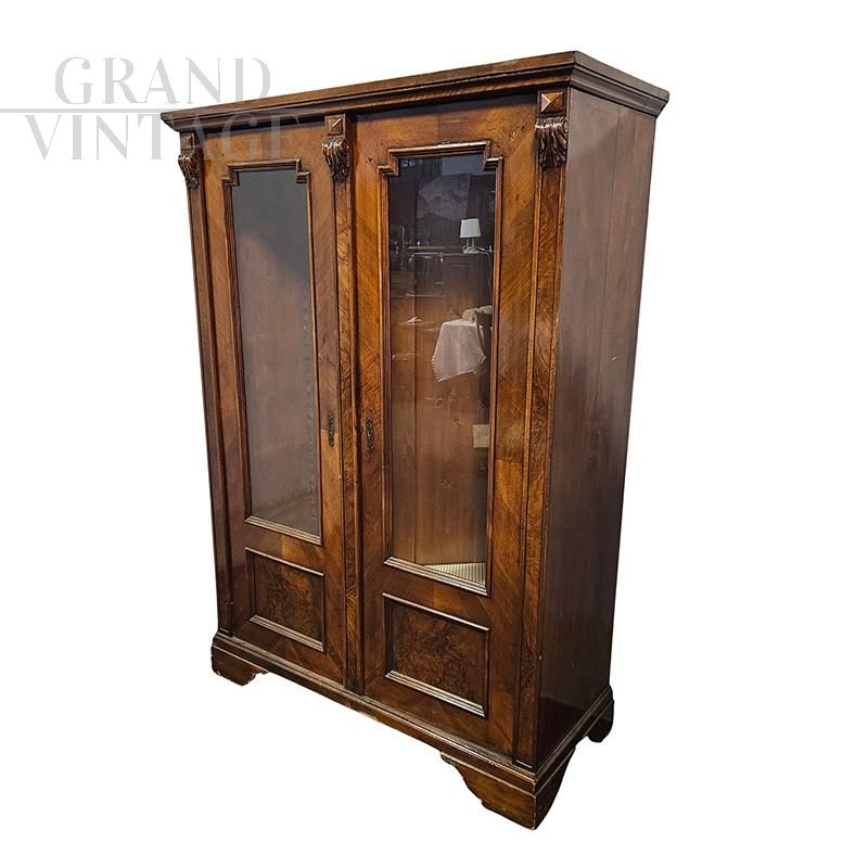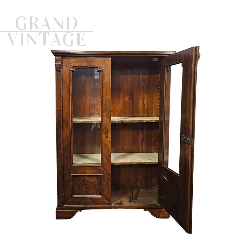 Finely carved walnut display cabinet with two doors and two useful internal shelves, 19th-century Italy.