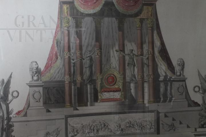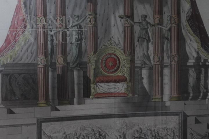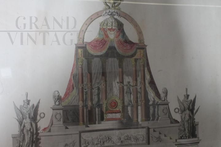 Antique drawing from the early 19th century dating back to the Empire period depicting a study of the Imperial Throne in a large square, complete with frame and glass.