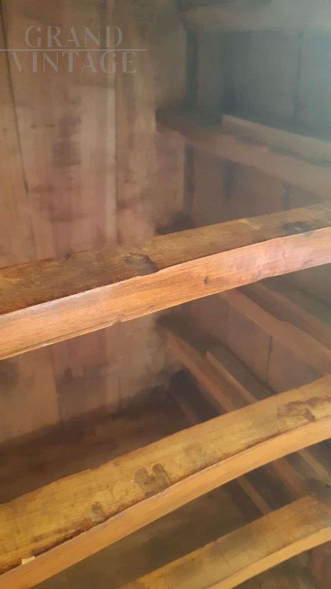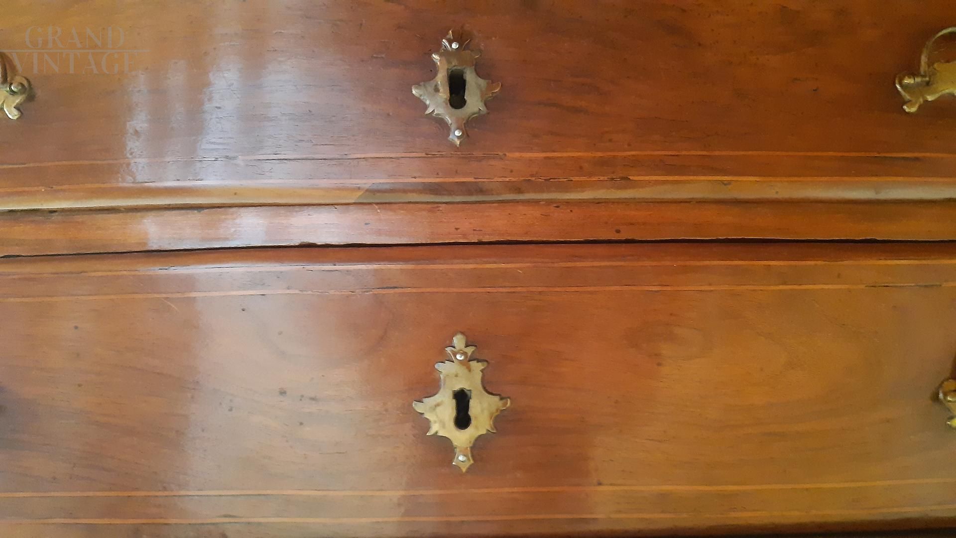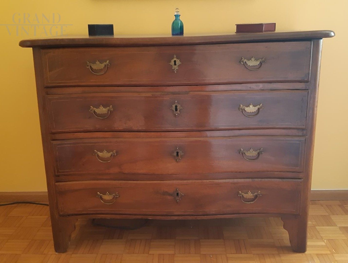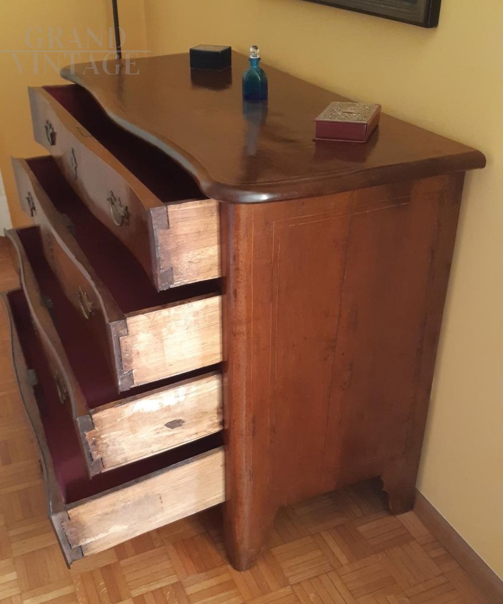Antique 18th century chest of drawers in walnut wood with fine threaded inlays. The chest of drawers is wavy and rounded and is equipped with four good-capacity drawers covered in red fabric. It is completely restored, structurally sound, does not require any intervention. It features a light inlay on all sides. It is in excellent condition. This handcrafted wooden chest of drawers is a unique piece of vintage furniture, meticulously preserved to maintain its original charm.