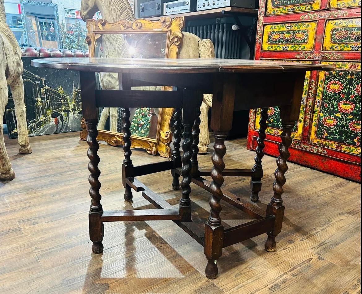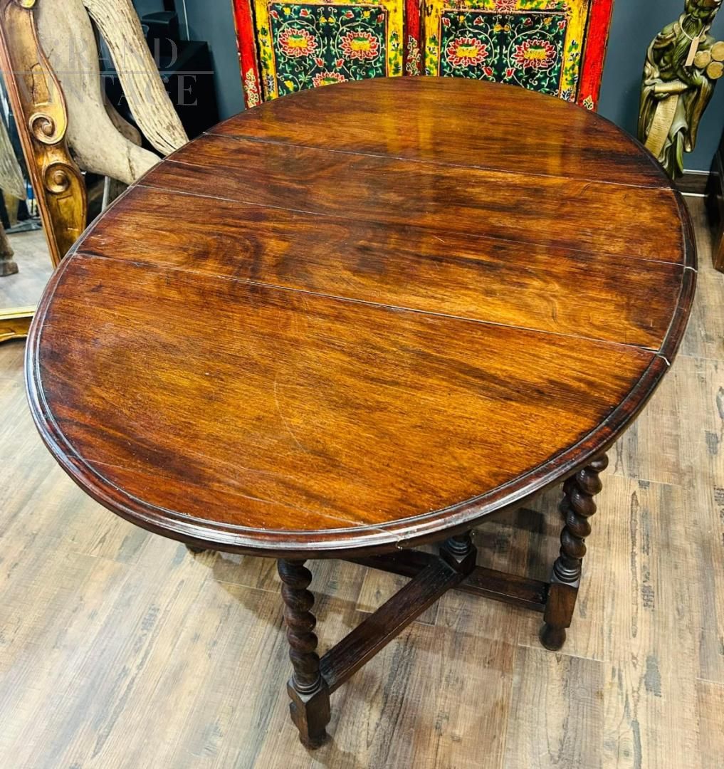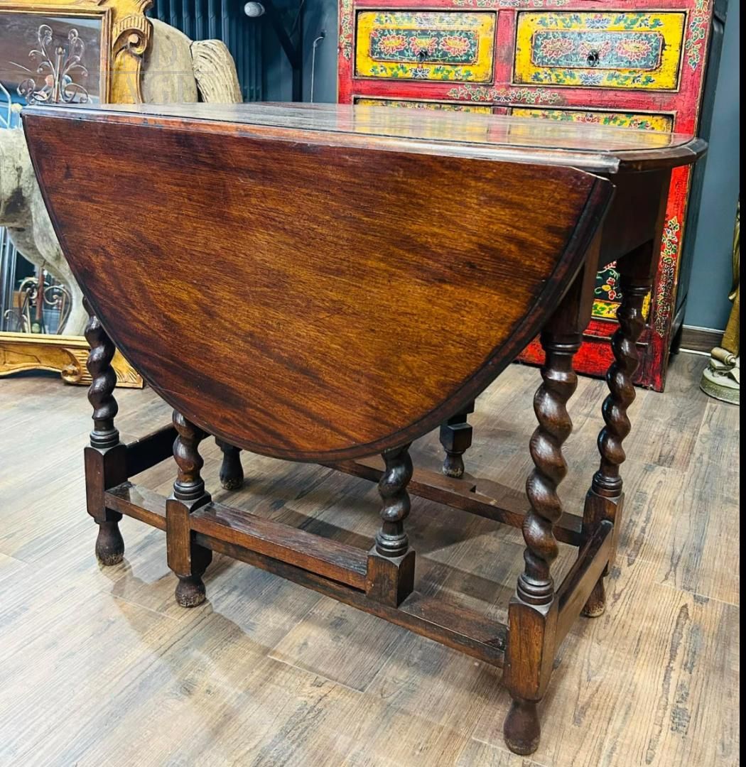 Antique foldable drop-leaf Pembroke table with splendid turned legs, period 1910s - 1920s.