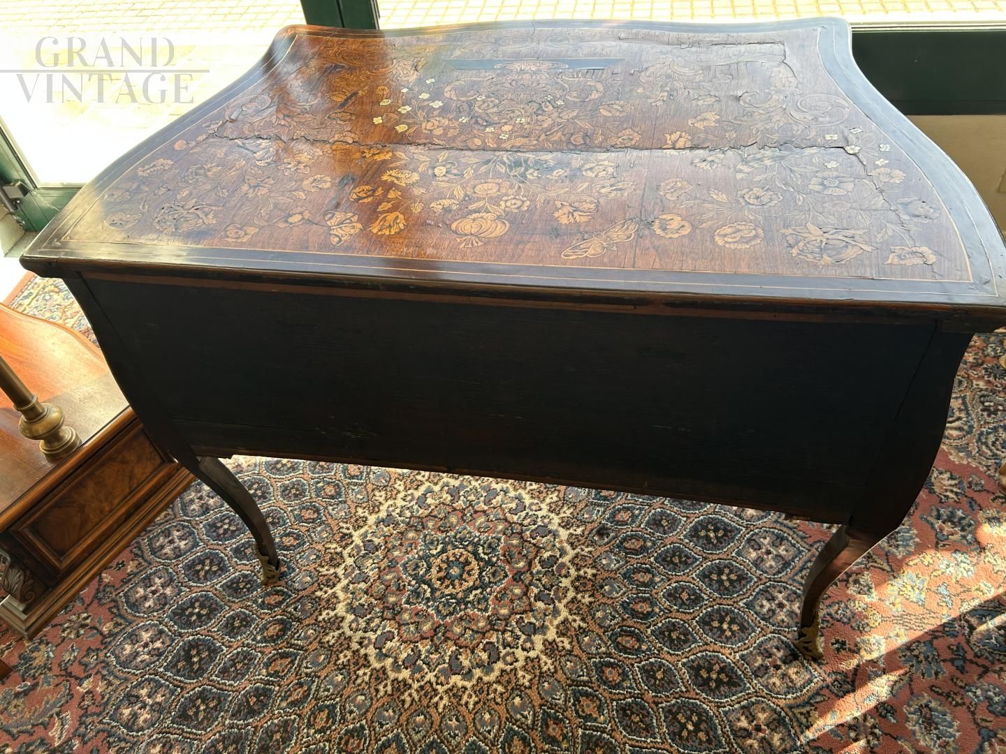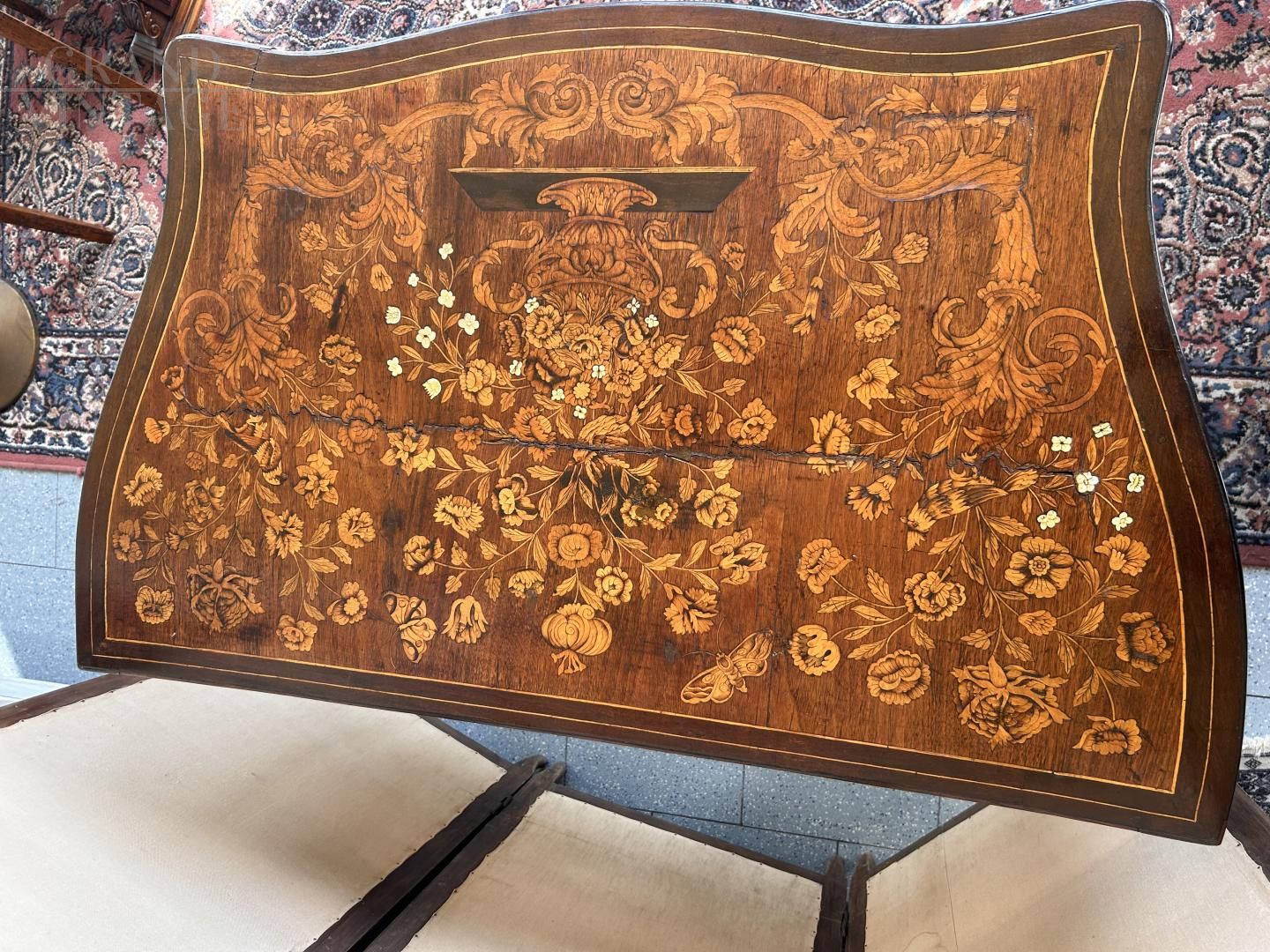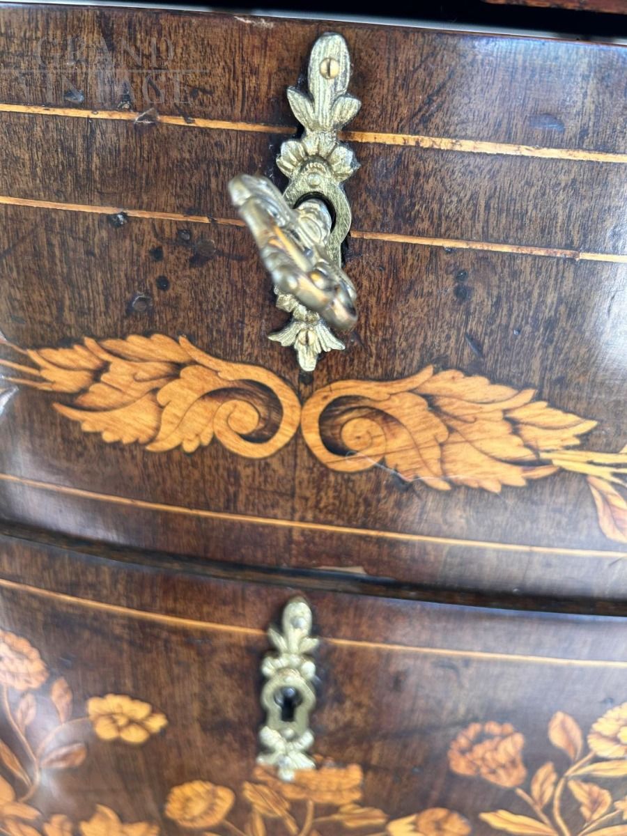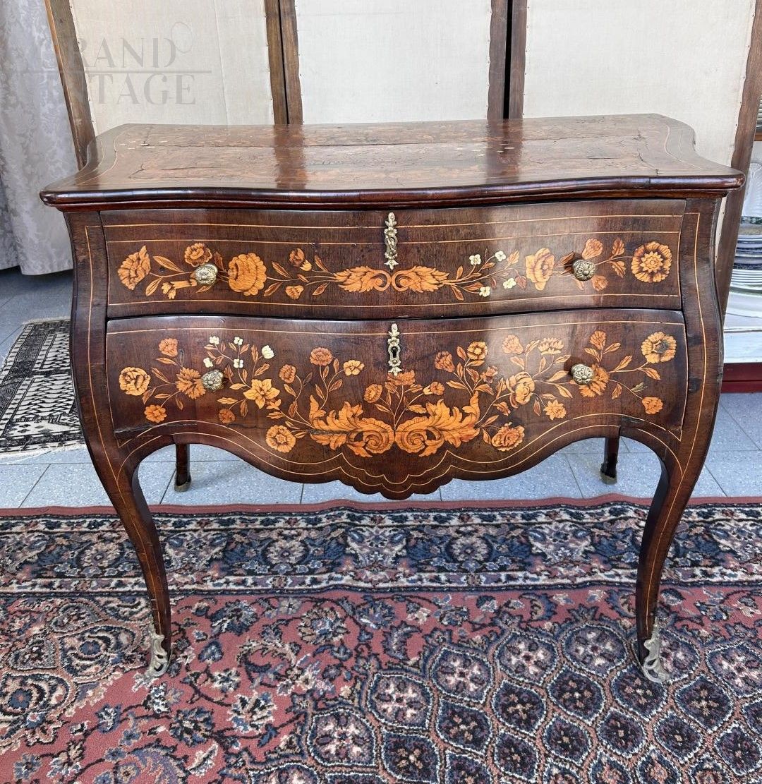 Wonderful antique Dutch chest of drawers from the 18th century inlaid with floral motifs on 3 sides with high quality cabinet-making work, some of the flowers in particular are bone inlays. The dresser consists of 2 drawers, one of which has dividers. Original keyed hardware, saber legs with brass feet. In good condition, it shows natural signs of aging.