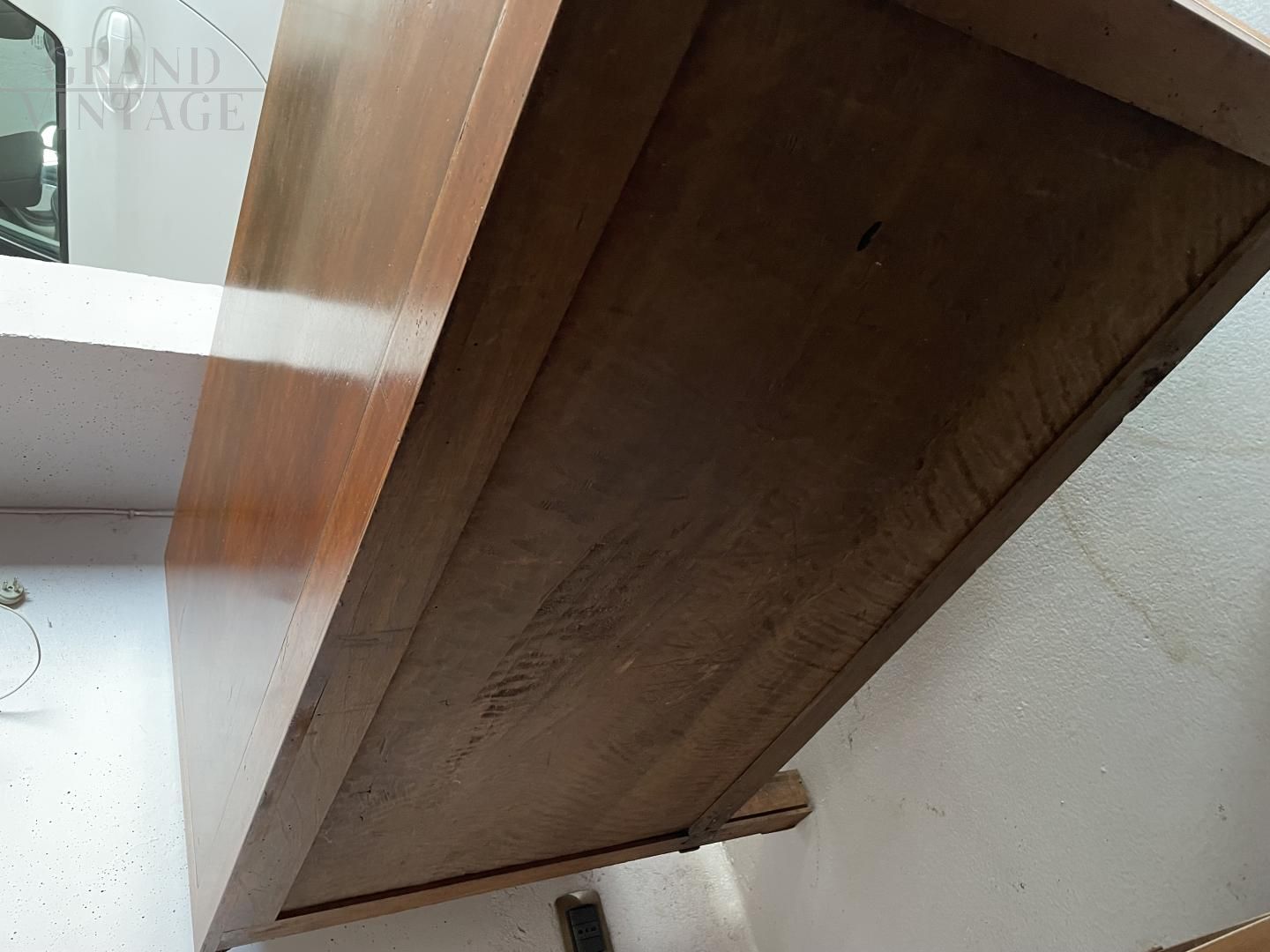 Antique Italian chest of drawers in walnut, Empire style from the first quarter of the 19th century. The piece of furniture has a rectangular top, obtained from a single centuries-old enveloped plank that rests on a high band with drawer.