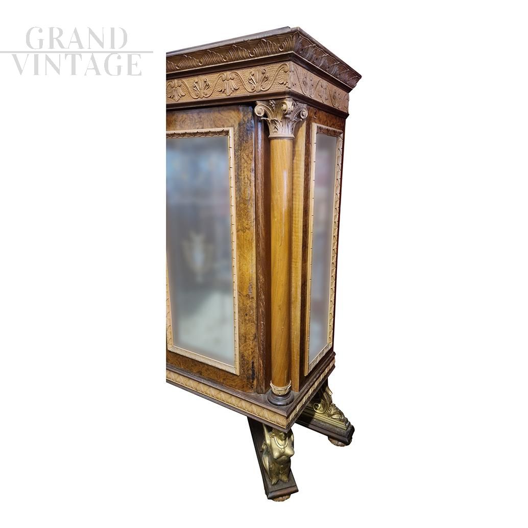 Antique Italian Empire style display cabinet made in the first half of the 20th century in walnut and other wood essences, with three glass doors and two columns on the sides. The entire display case is carved with maple and walnut worked with floral and geometric motifs, the three doors and sides are veneered in walnut root. The base, corresponding to the two columns, is characterized by the presence of two gilded wooden caryatids to support the piece of furniture.