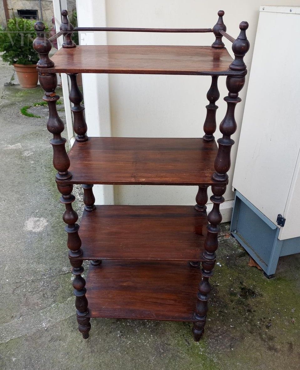 Antique étagère whatnot open bookcase in walnut wood with 4 shelves supported by turned columns. It shows signs of aging, as shown in the photos.