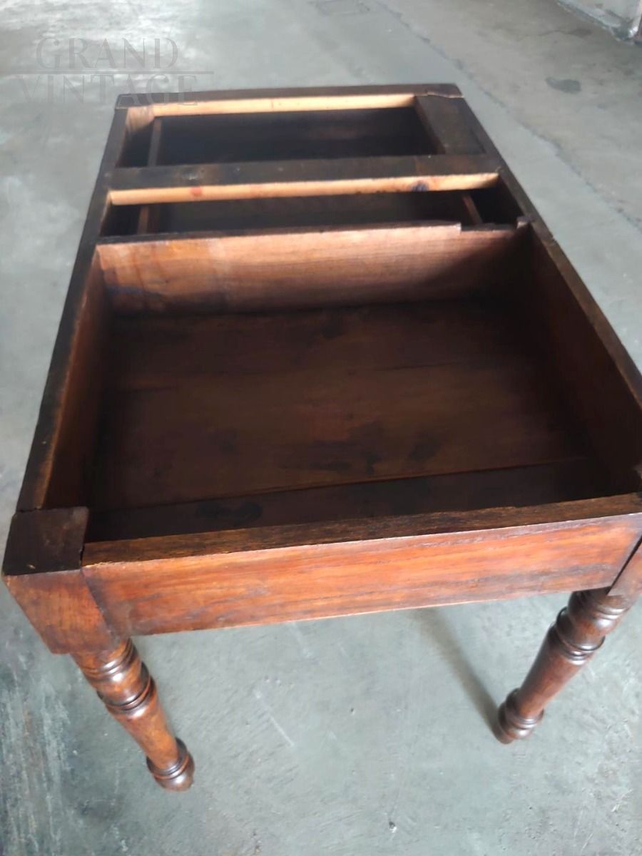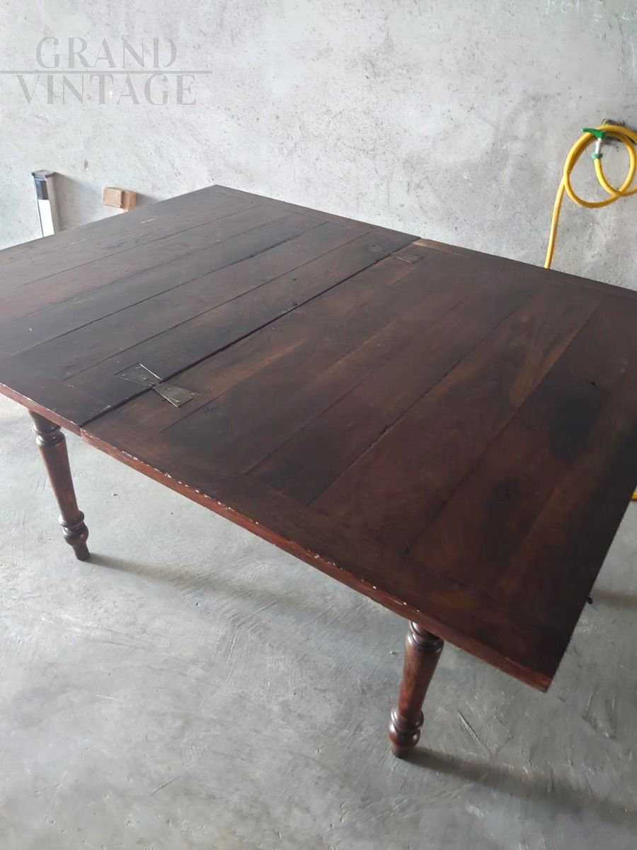 Antique extendable table from the first half of the 19th century in walnut, with turned legs, restored, in perfect condition.