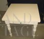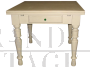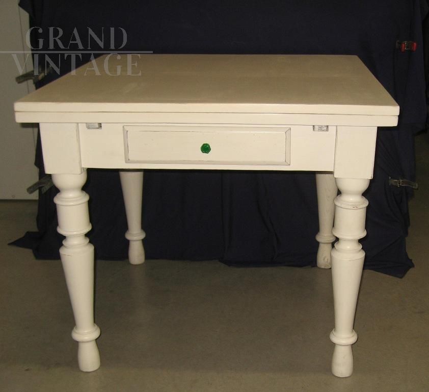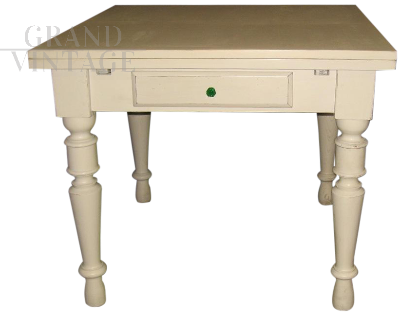 Tavolo in legno massello con piano di cm. 89 x 91,5. Sotto il piano nasconde due prolunghe allunghi di cm. 40 cada uno, che sfilandosi permettono al tavolo di allungarsi. Dotato di un cassetto nella fascia sottostante il piano e di eleganti gambe tornite. Il tavolo è stato restaurato completamente successivamente è stato laccato color avorio di recente, con invecchiamento a cera.