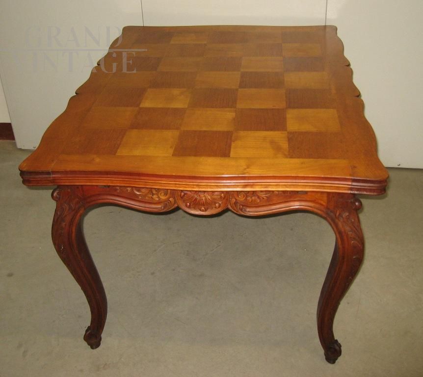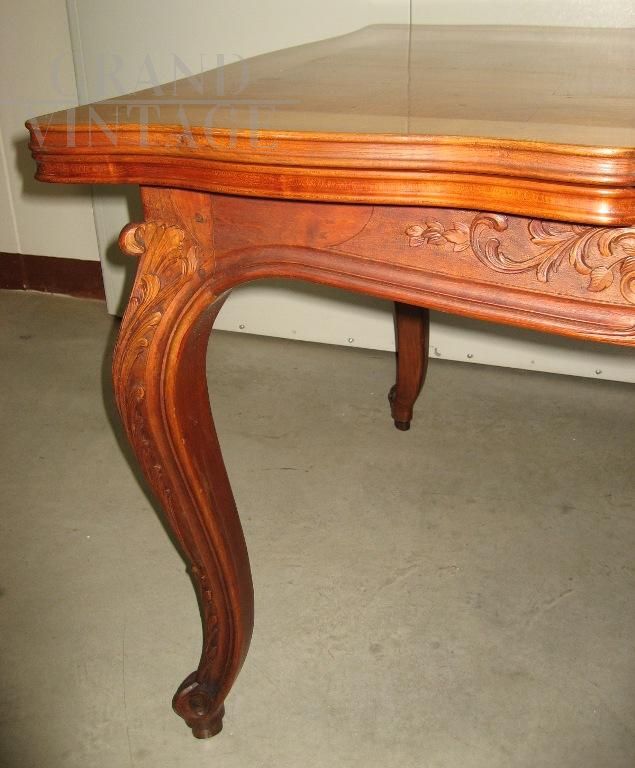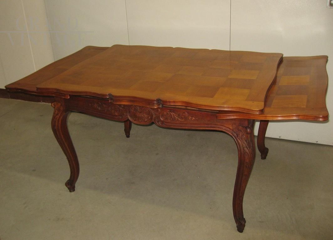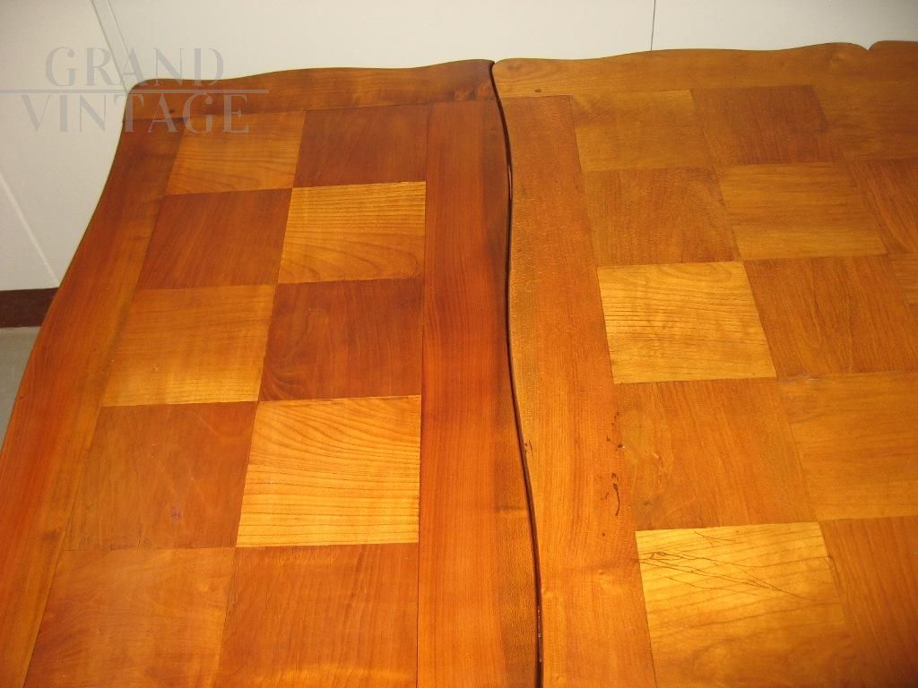 Extendable Louis XV style table with two extensions, in cherry wood. Top framed in solid cherry, internally has veneered square motifs. Shaped and carved band, wavy legs, solid wood. Table restored and polished in all its parts.