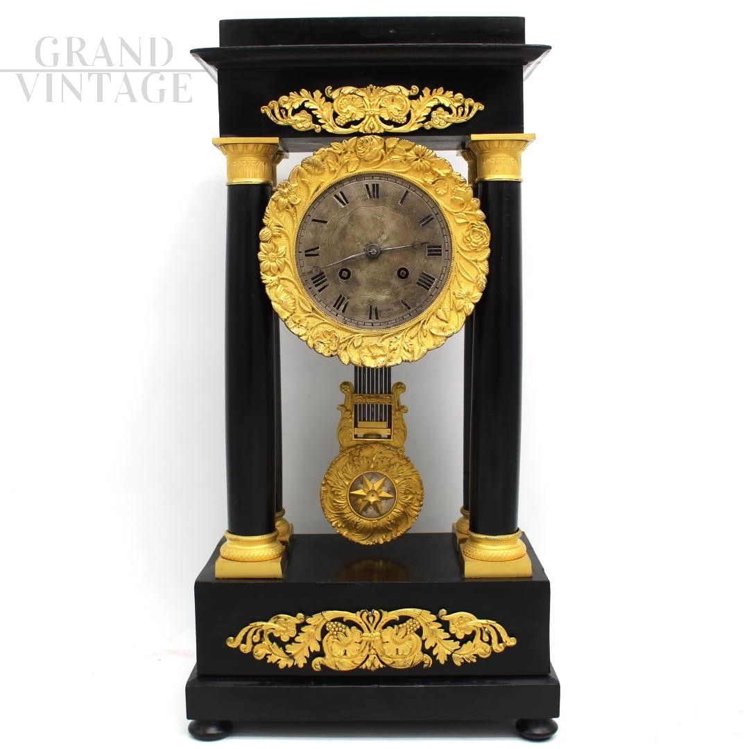 Empire pendulum clock in ebonized wood, complete with gilded bronzes, mercury gilding, early 19th century - Empire (Restoration period), from France.