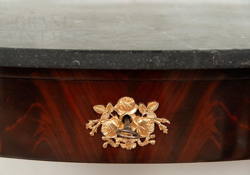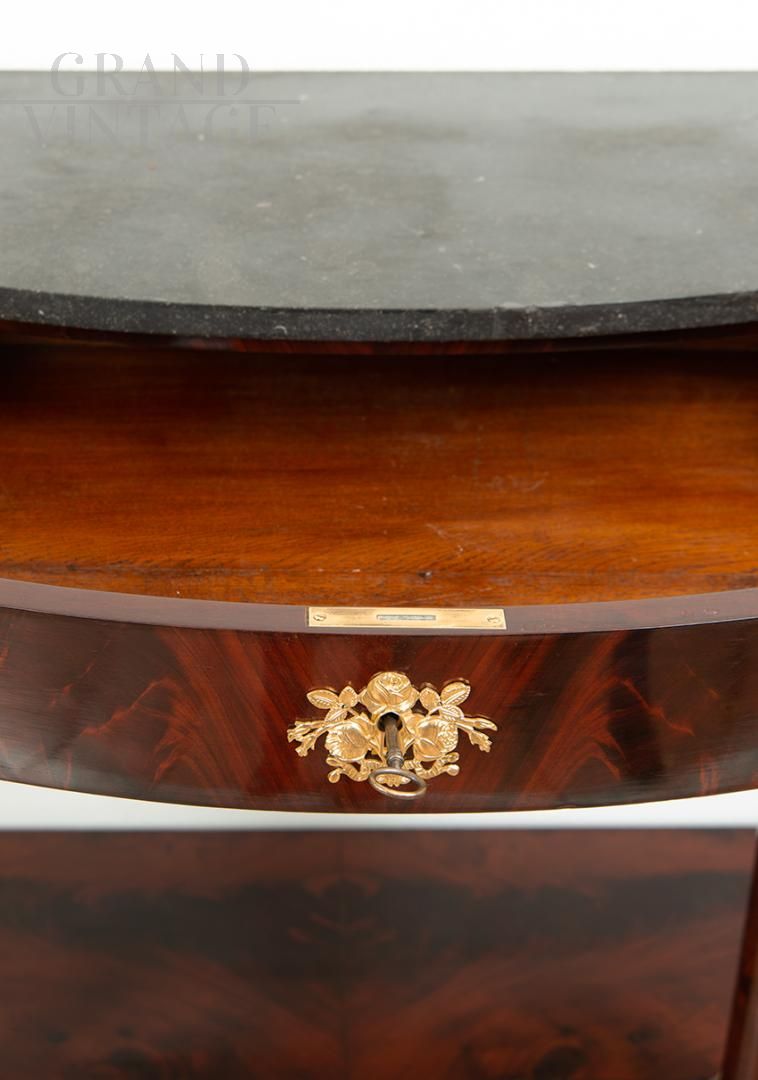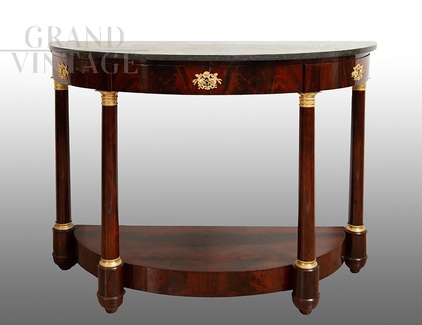 Antique French Empire Demi Lune crescent half-moon console in mahogany feather with black Belgian marble top. The front is characterized by three feathered columns with a finely chiselled gilt bronze base and capital. The under-top band is characterized by three drawers including a larger central one and two lateral ones enhanced by gilded bronze elements with a floral motif. The console has been restored by master craftsmen with traditional method shellac and handmade alcohol.