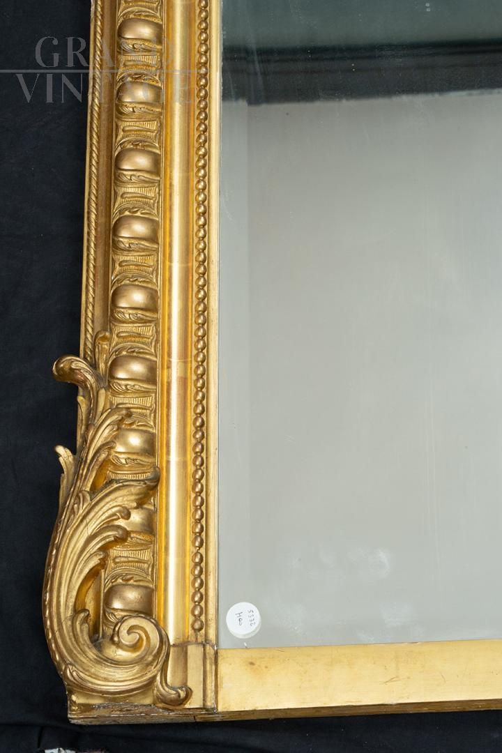Antique Napoleon III mirror in carved and gilded wood with 24Kt gold leaf on a layer of Armenian bole. The front elevation is characterized by an imposing cymatium with coffins decorated with vegetal motifs in the centre. On the four corners there are beautiful scrolls alternating with pods.