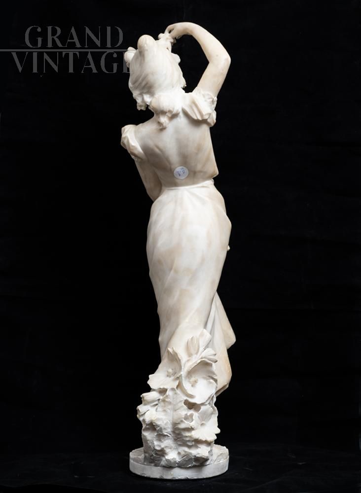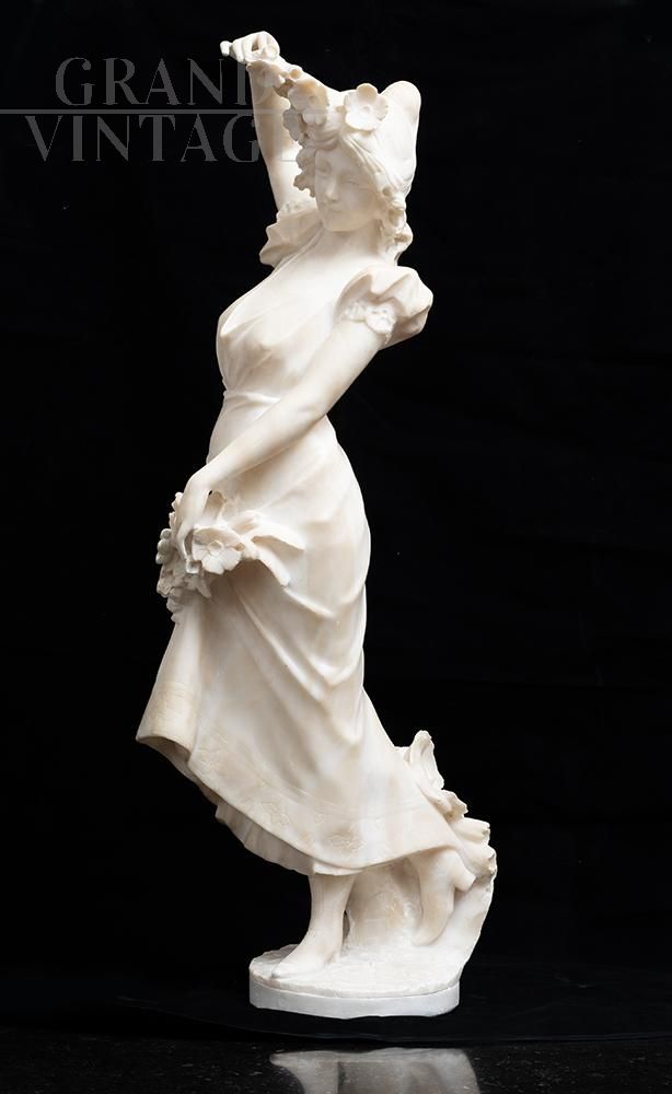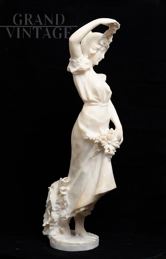 Antique alabaster sculpture from the French Napoleon III period depicting a woman with flowers. The female figure is presented with a very light dress and with both hands holding cascades of flowers. With her right hand she holds a crown that wraps her head, while with her left she holds a bouquet of flowers. The left foot appears to be resting on a lawn and gives a vertical impetus to the entire figure. The care and precision of the details, the fineness of the face of the robes are of the highest quality.