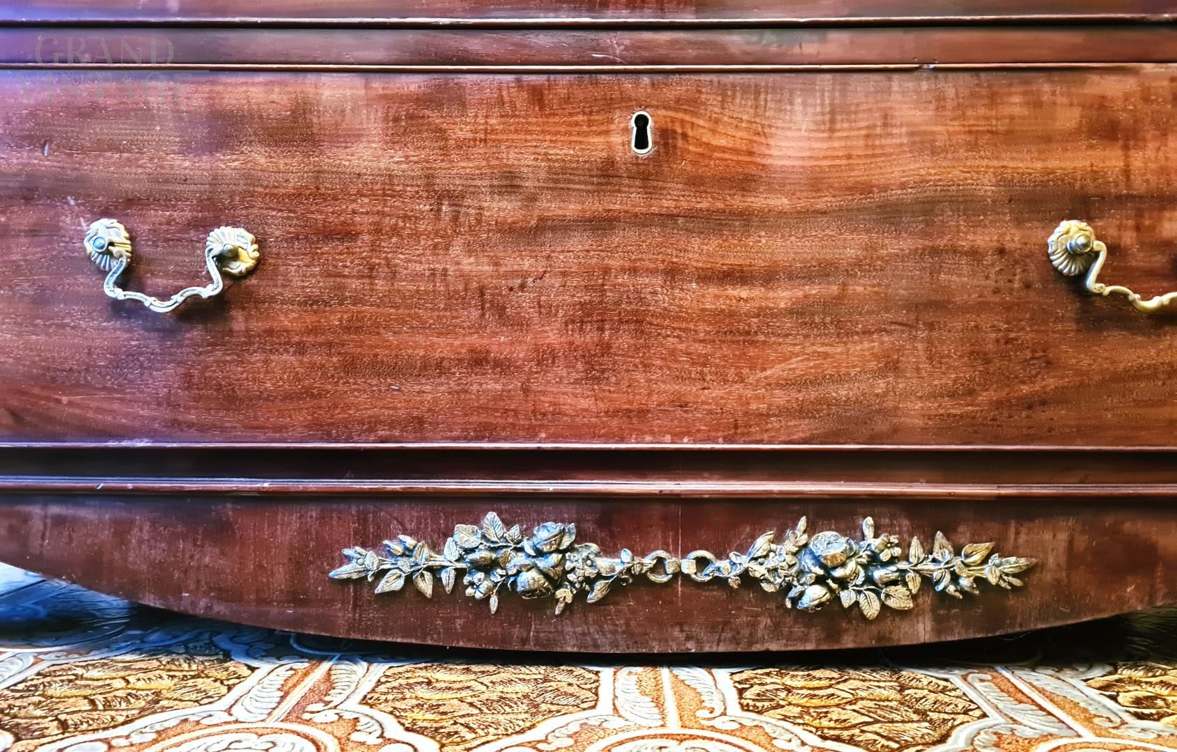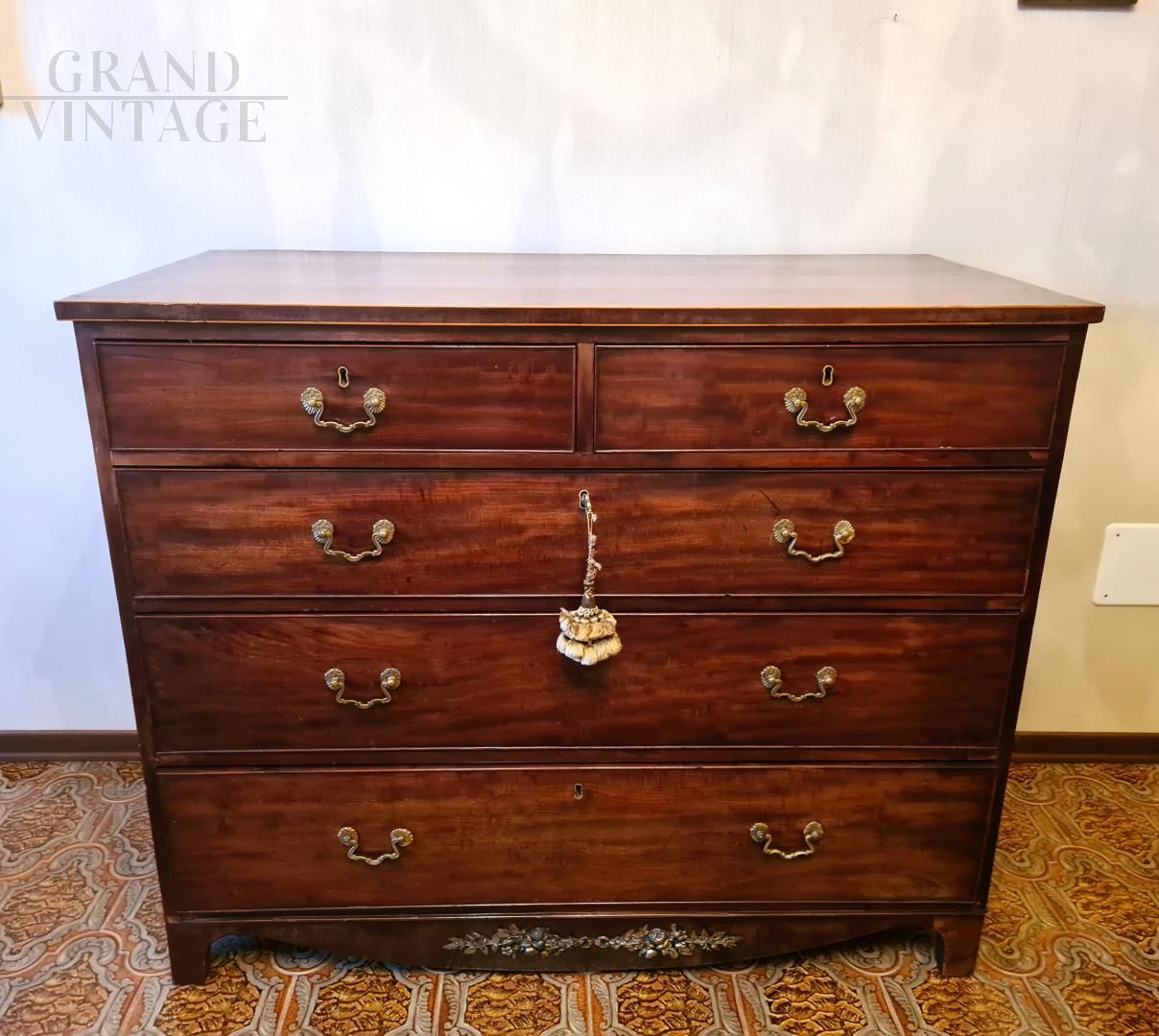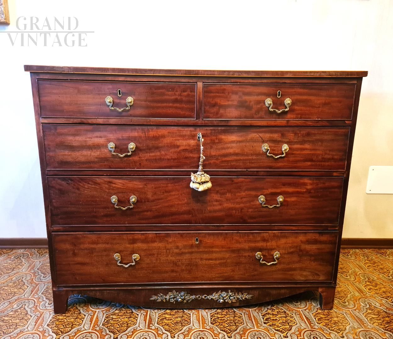 Antique Georgian mahogany dresser from the 19th century, featuring five drawers with swan-neck handles and brass floral friezes on the bottom. The key, though the lock is not working, is included. It shows natural signs of age.
