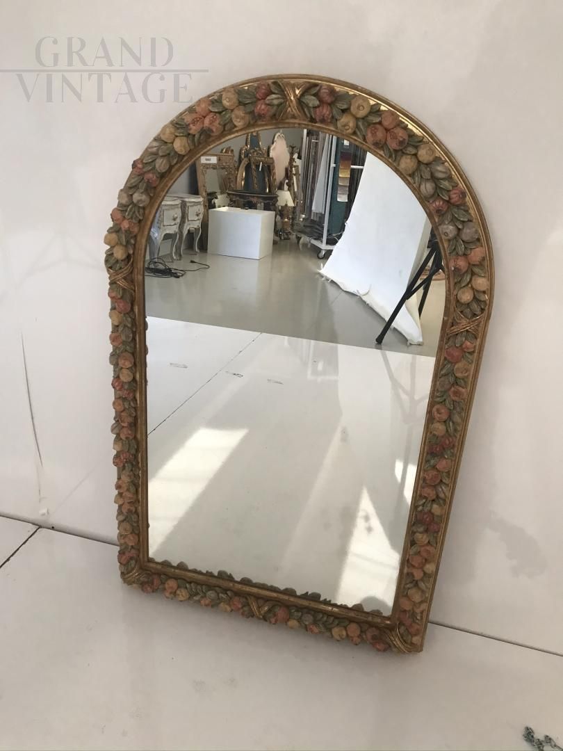 Vintage hand-carved mirror, fruit motif, finely made in polychrome decoration. Freehand application.