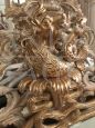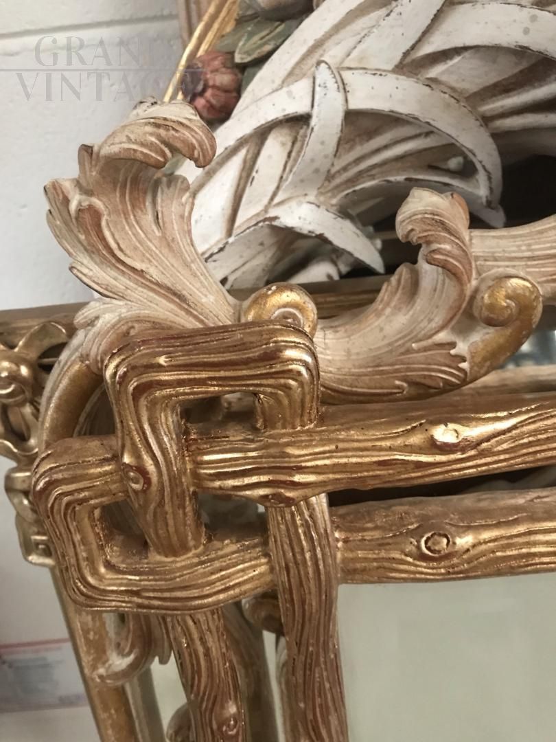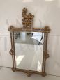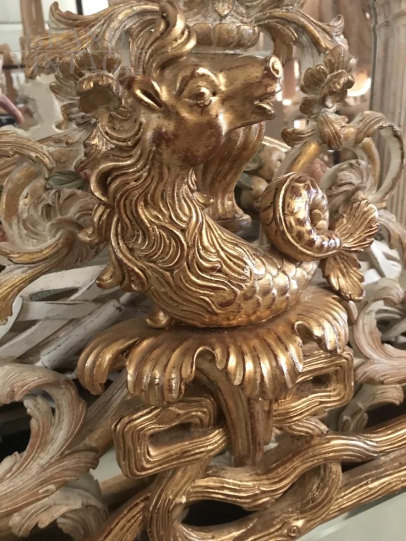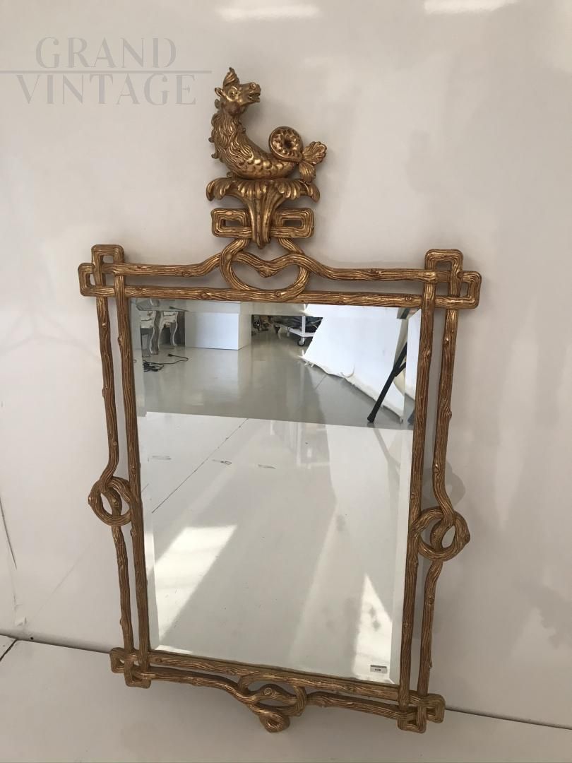 Finely hand carved mirror with knots in the wood and mythological figure of hippocampus, late 18th century style, completely in antiqued gold leaf. In excellent condition.
