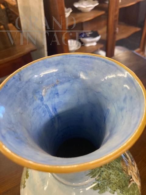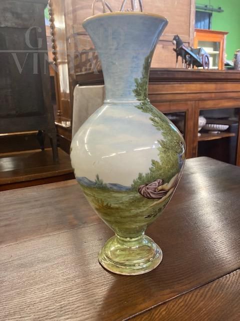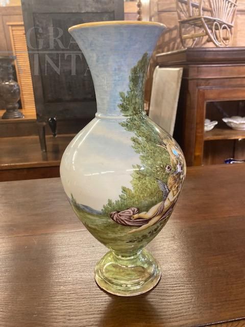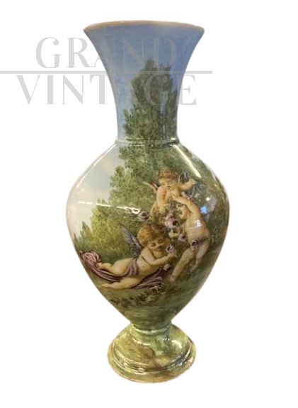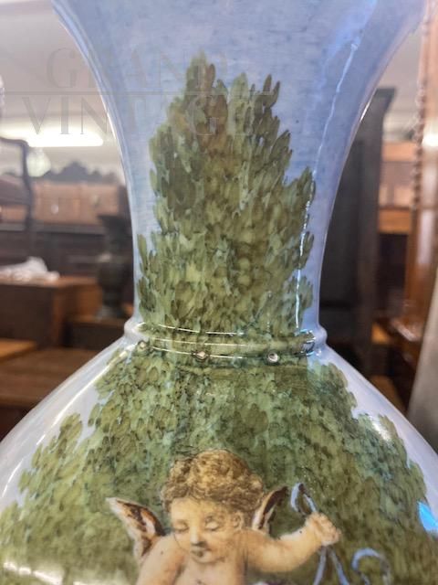 Antique vase in polychrome majolica ceramic painted with nature and cherubs, Ginori manufacture from 1850s, of very high quality and in perfect condition, signed on the base.