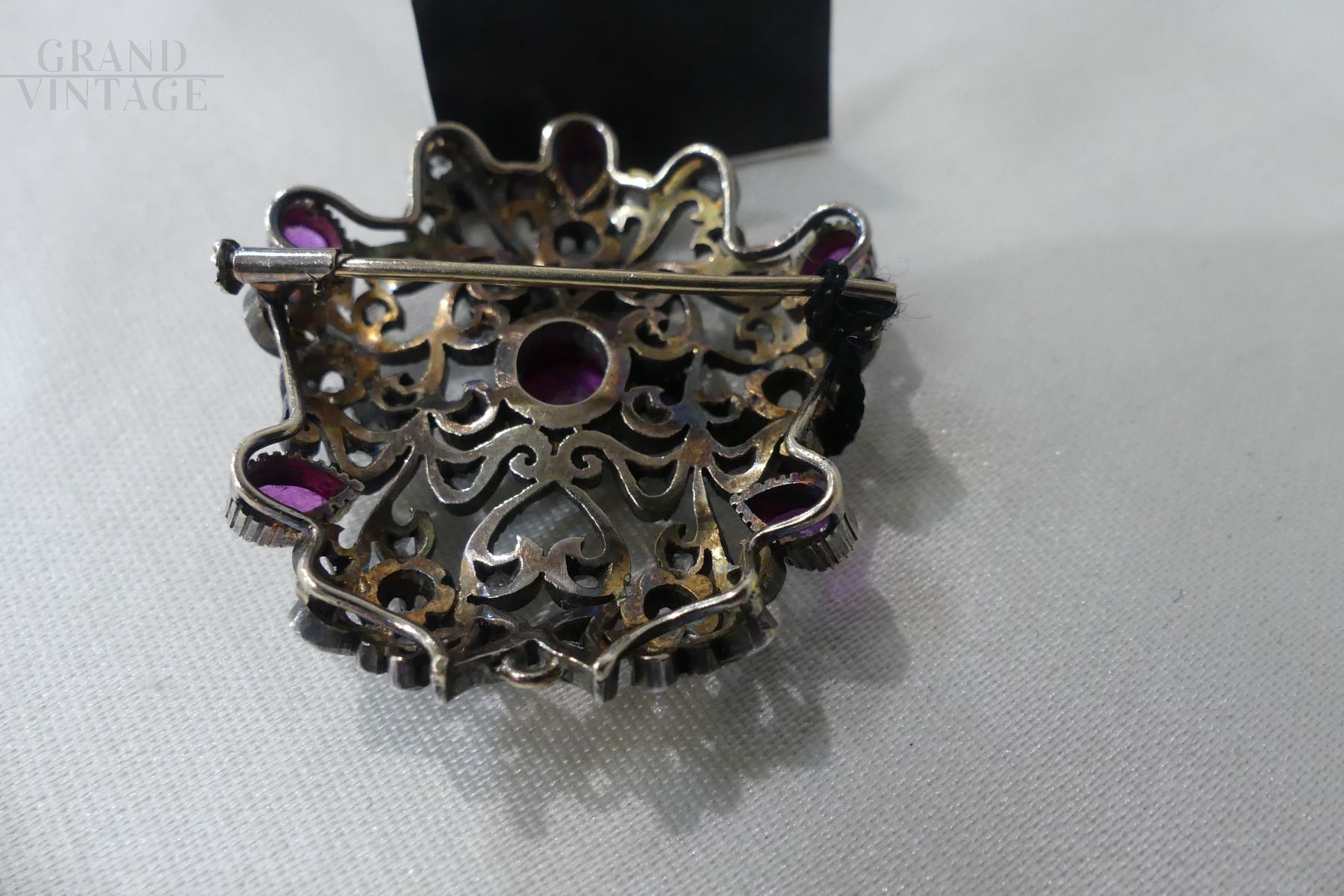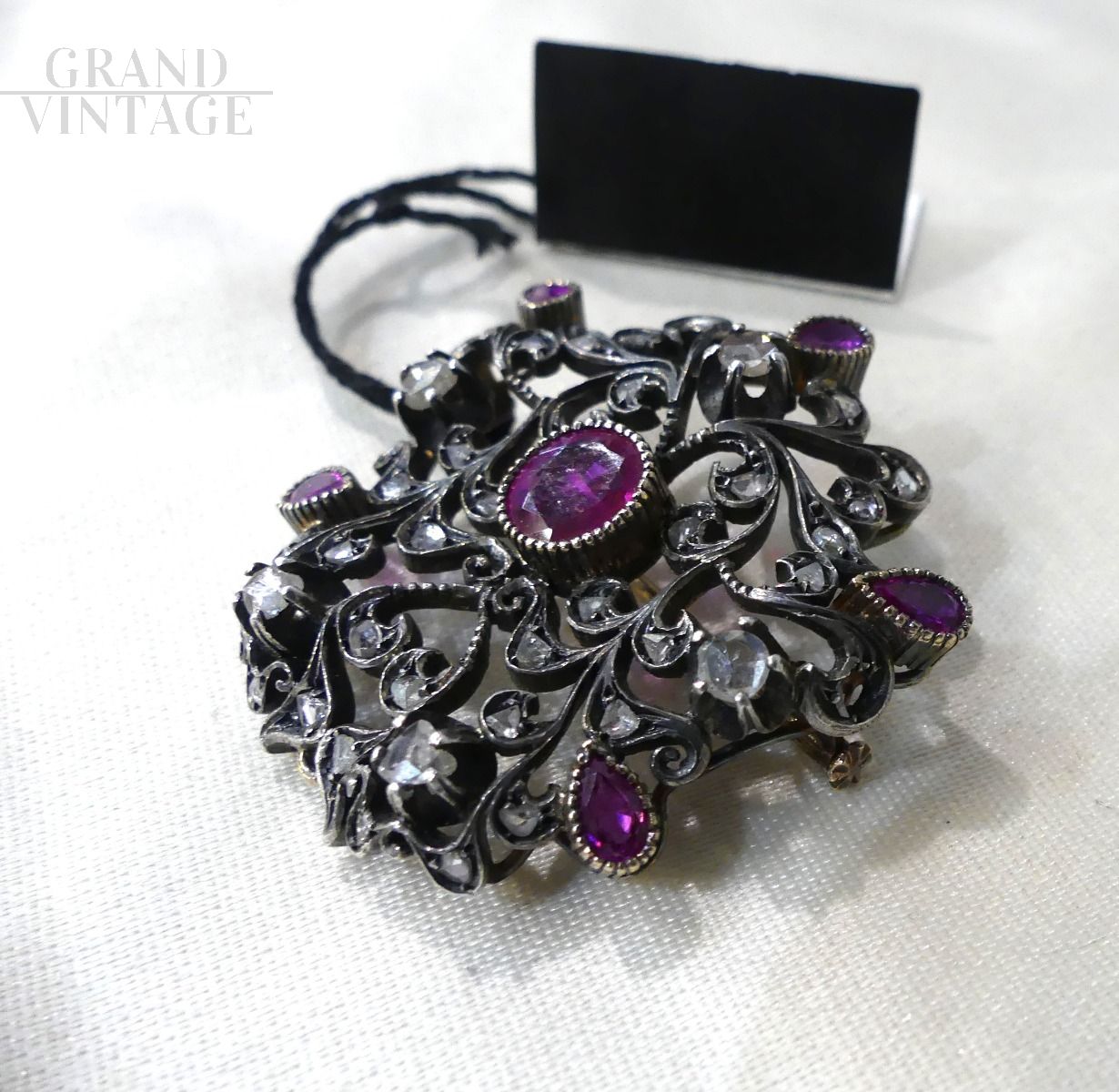Spilla antica in oro e argento con rubini e diamanti