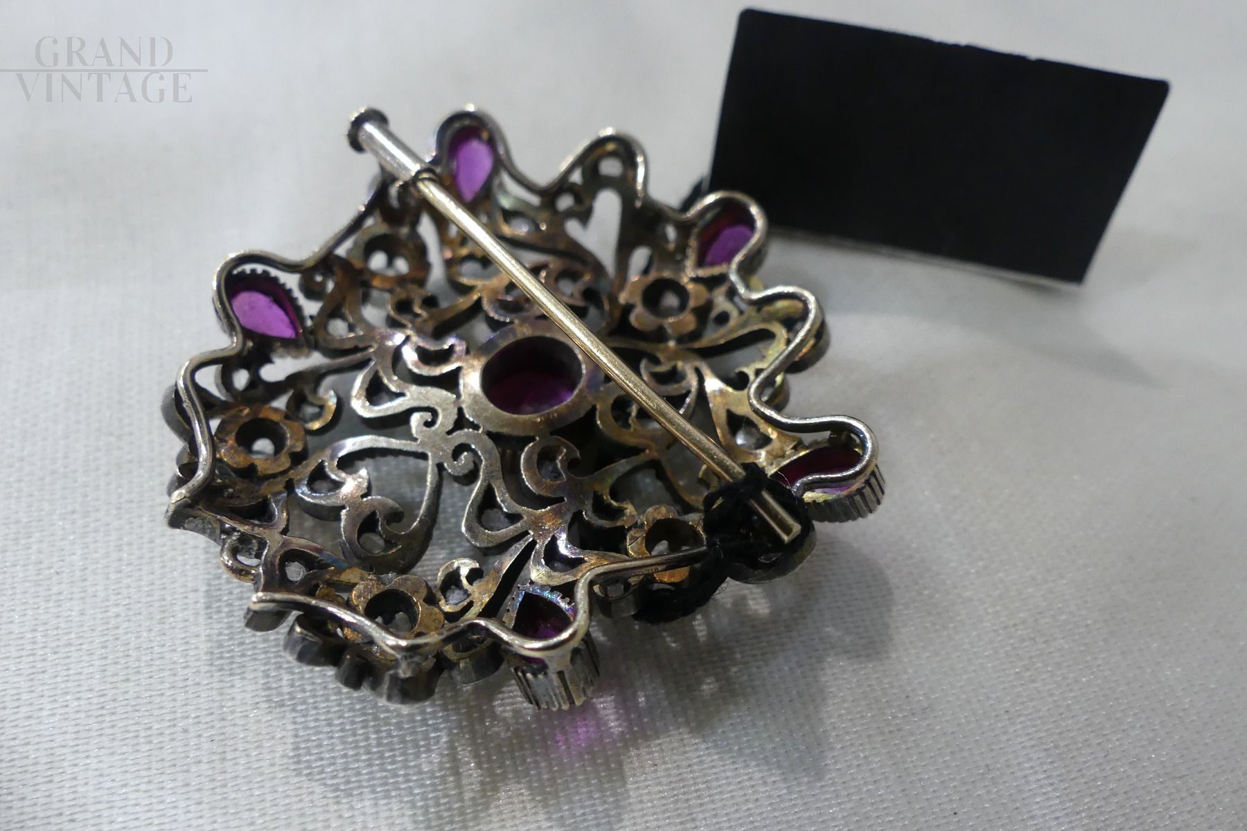 Precious antique 19th century gold and silver brooch in rocaille scrolls with rubies and rose-cut diamonds, 15.50 grams.
