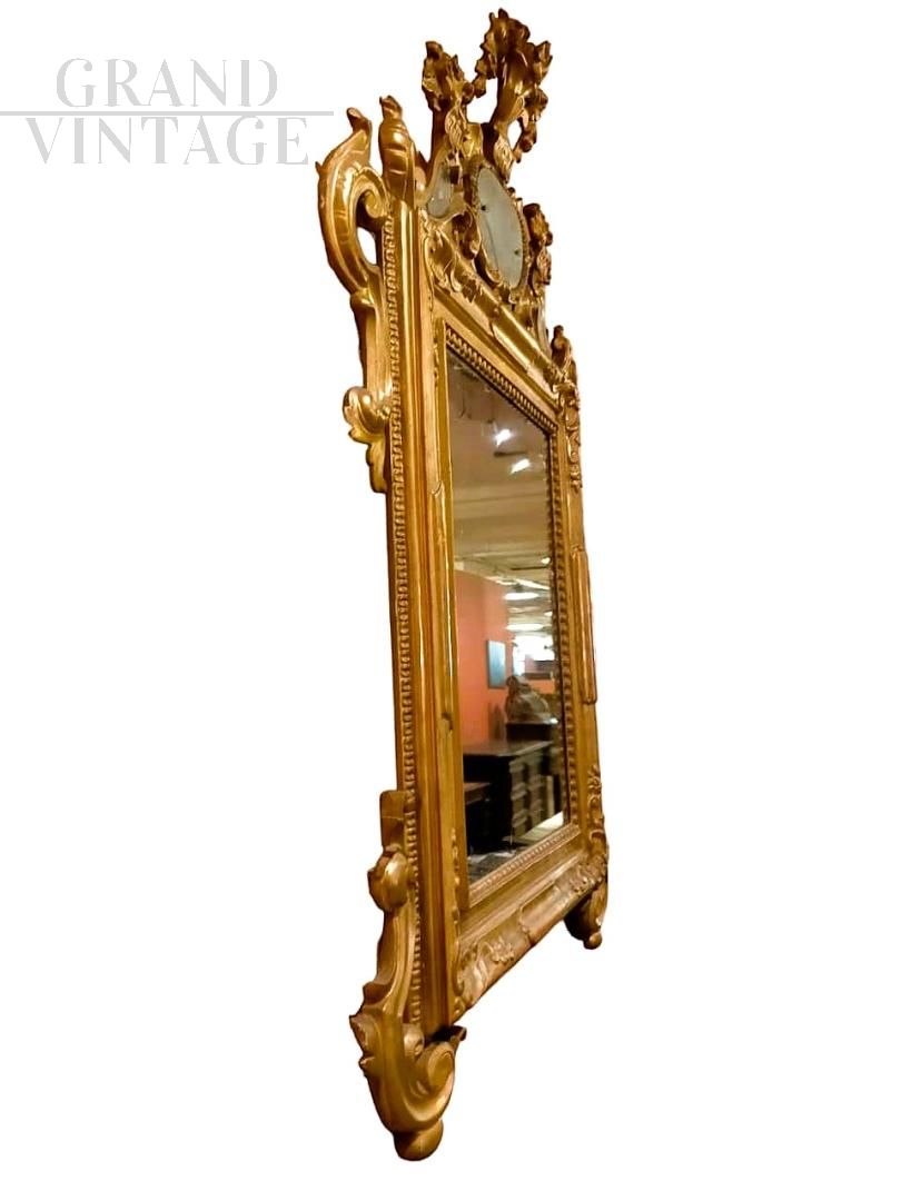 Large Venetian Louis XV mirror in carved and gilded wood with gold leaf, with original mercury mirror, decorated with a cymatium carved with scrolls, floral motifs and small decorative mirrors. Period: second half of the 1700s.