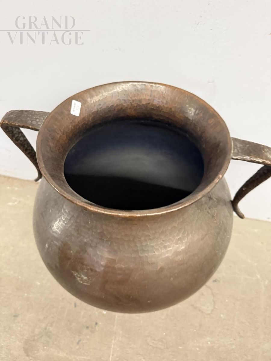 Antique two-handled amphora vase or jug in hammered copper with two handles on the sides, a beautiful object made in the 18th century, 50 cm high and 44 cm in diameter.